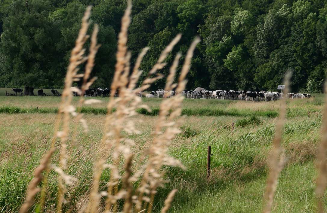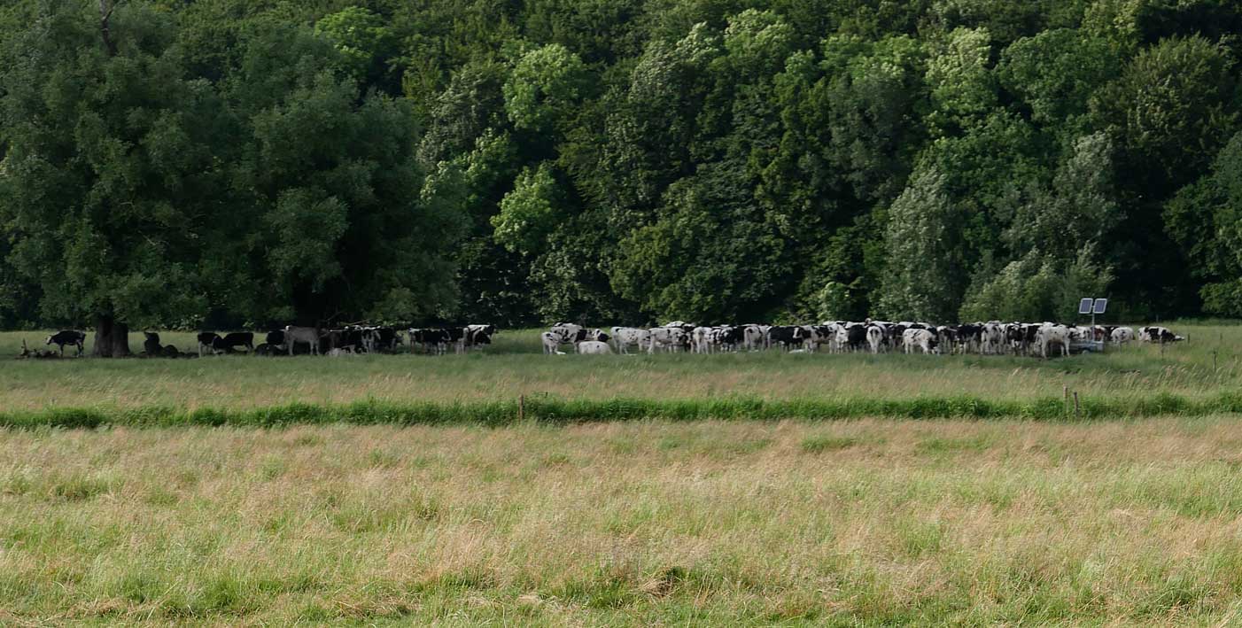 zeigt uns am Waldrand schwarz-weisses Fleckvieh, früher morgen und abends gemolken
