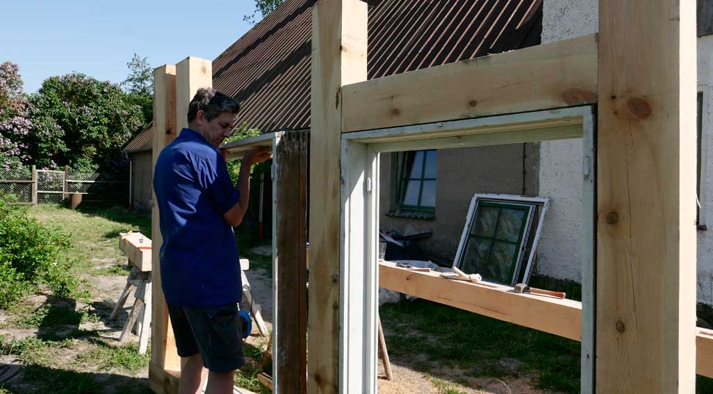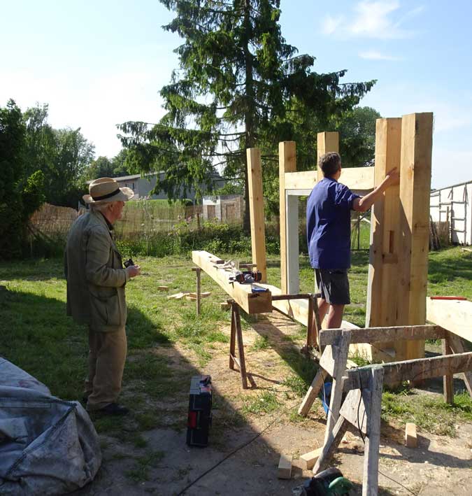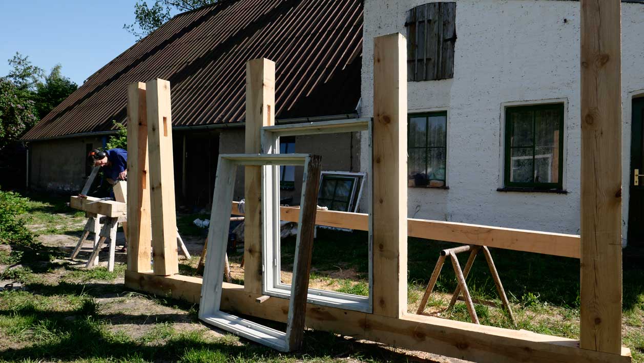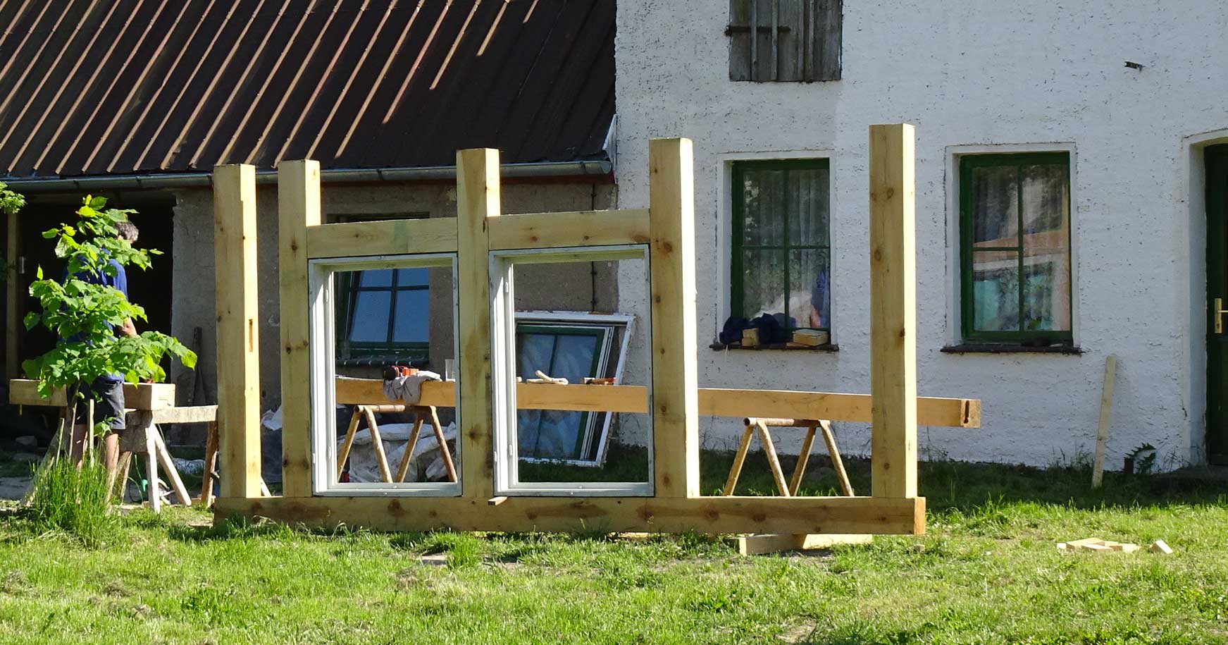 Die Fensterwand nach altem Mass und Material aus Holz und Lehm dann ensteht weiter
