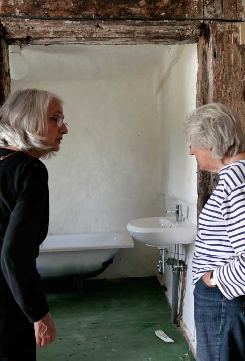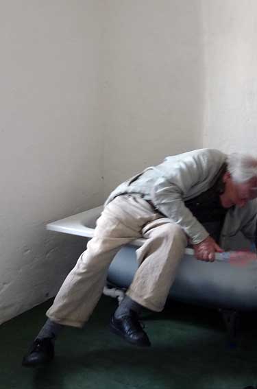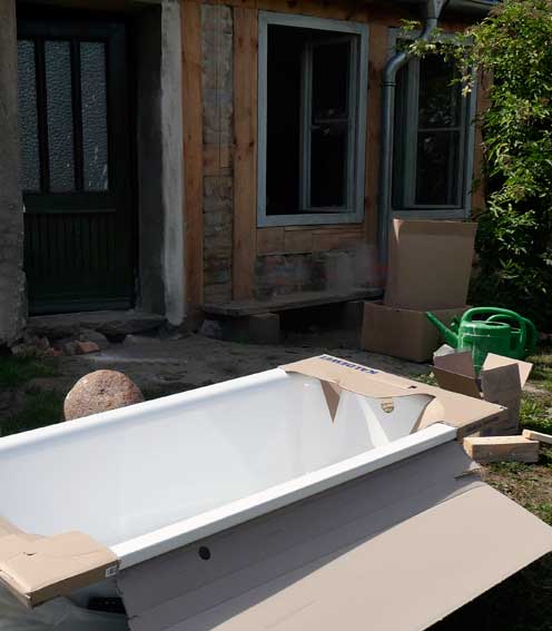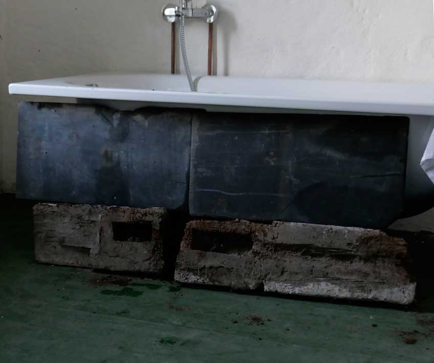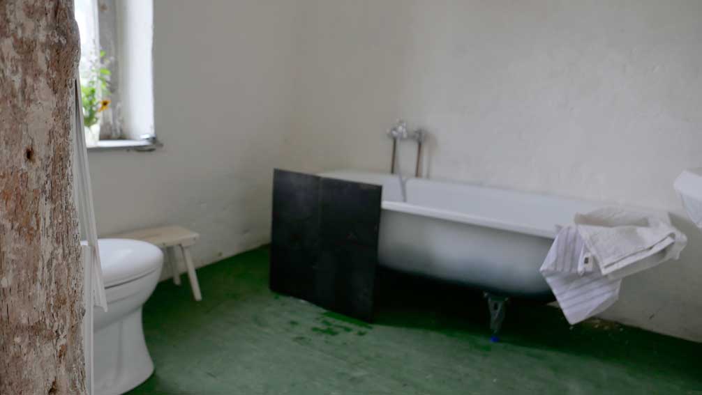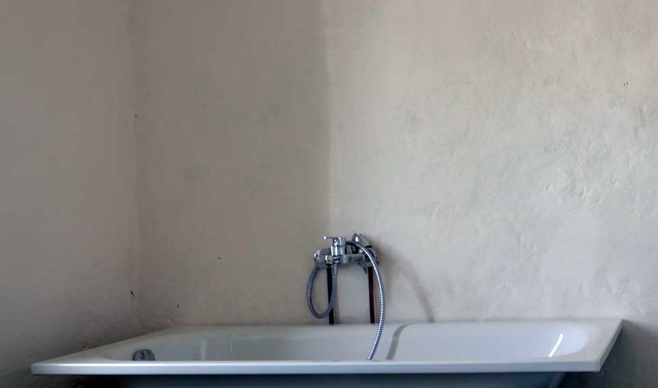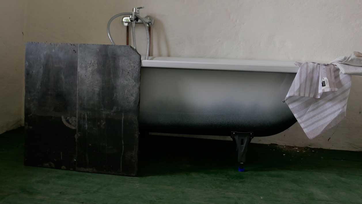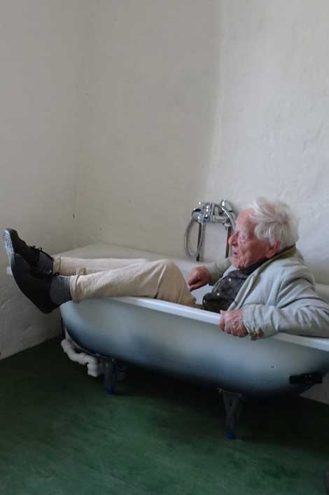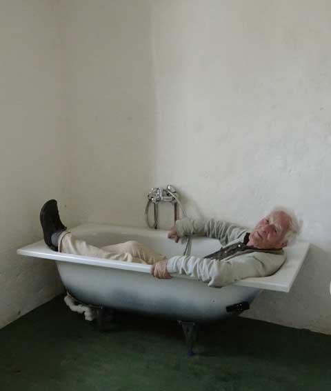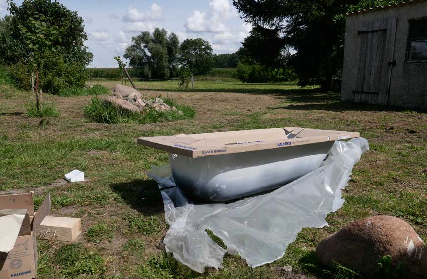 Noch mal. Wie aus der Wanne zu kommen ist, wenn man sich an der Apparatur hochzieht, rechts, und links abstemmt auf der Kanne der Wanne. In München.