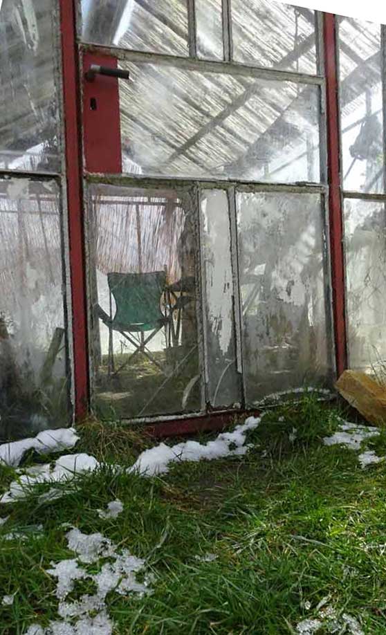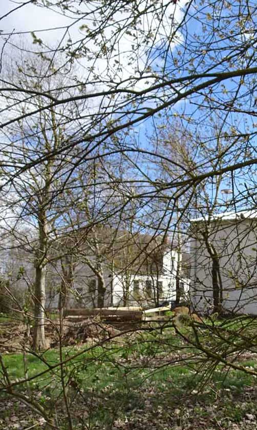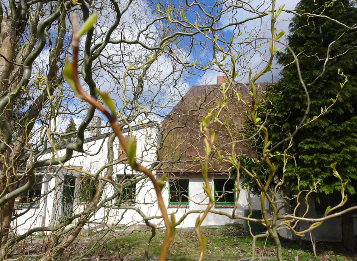 von hinten das Gutshaus und die Halle warten um neuen Weios und Dach