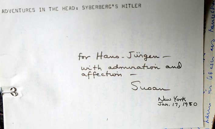 Aus NY vor der Premiere des H-Films die Überreichung des Essays dazu von Susan Sontag in der nächsten Nummer von der NY Review of books, gerade ungekürzt durchgekämpft.