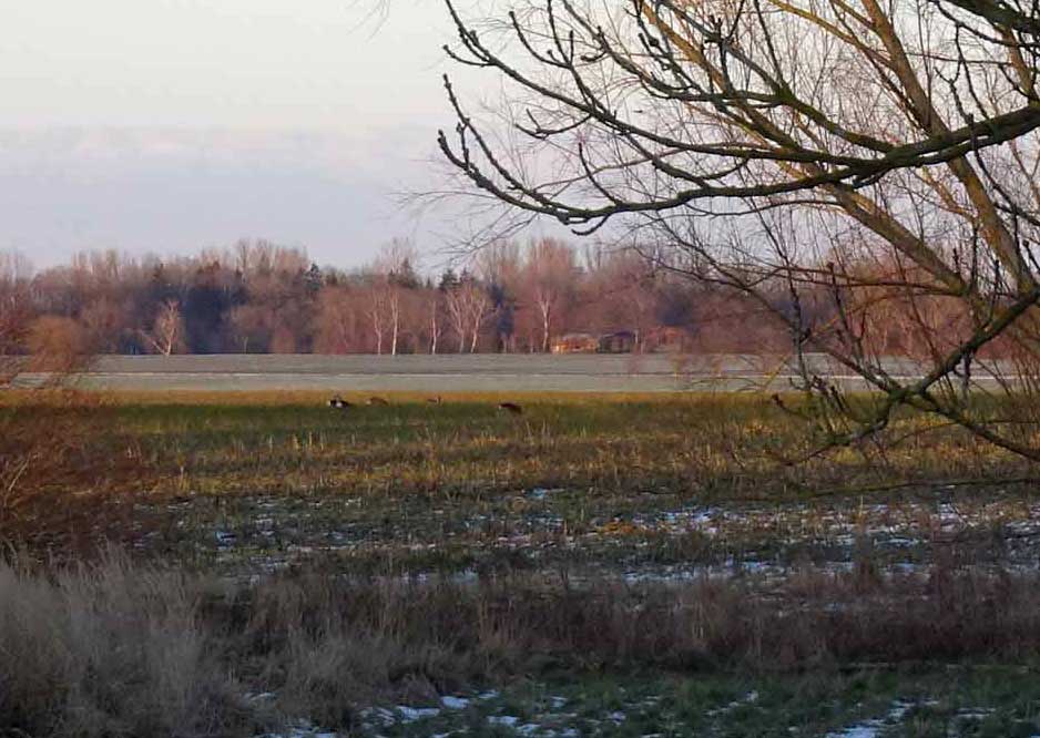 Auf den Feldern die Rehe hinter dem Graben dürfen nicht hinein in Park und Garten, die Triebe sind zu schützen. Die Zäune wieder helfen.