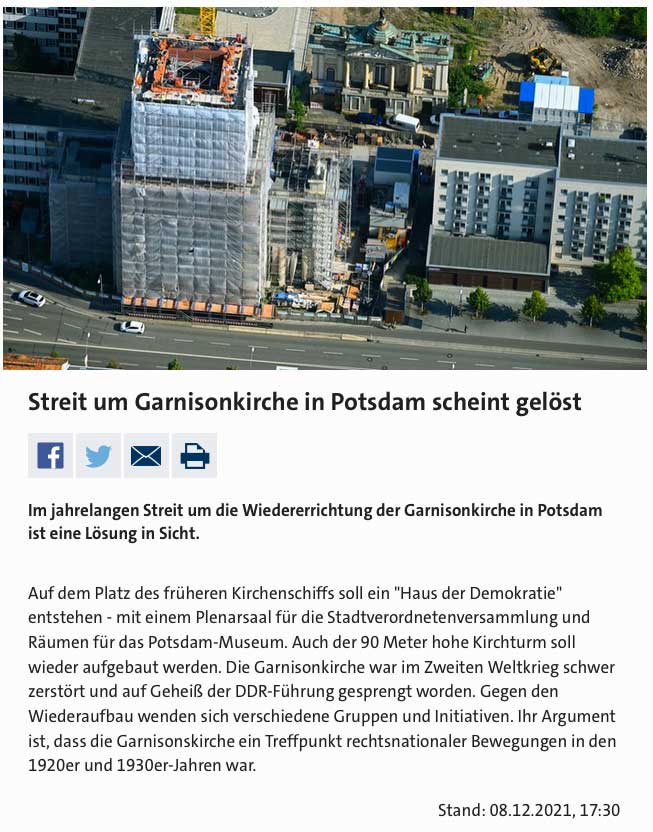 Auch in Potsdam scheint es nun eine Lösung in Sachen Garnisonkirche zu geben (Hitler und Ulbricht). Von Hiler besucht und von Ulbricht abgerissen, in DDR Plattenbau. Die evangelische Kirche zeigte kein Interesse. Der Bundespräsident kündigt einen demokratischen Lehrpfad im Bereich des Turms an. Wohl durch engen Grund im Kreis. Und vielleicht mit Durchblick auf das Demokratie praktizierende Haus der Demokratie nebenan.