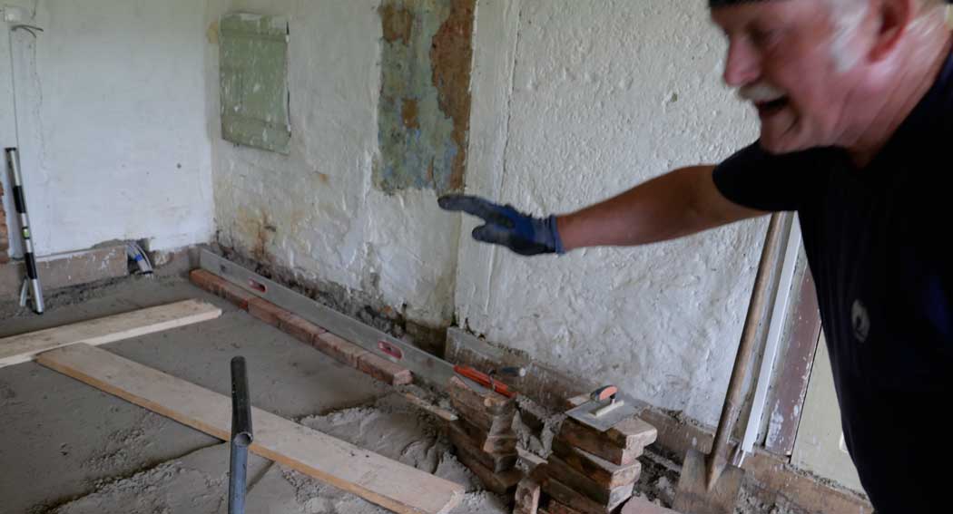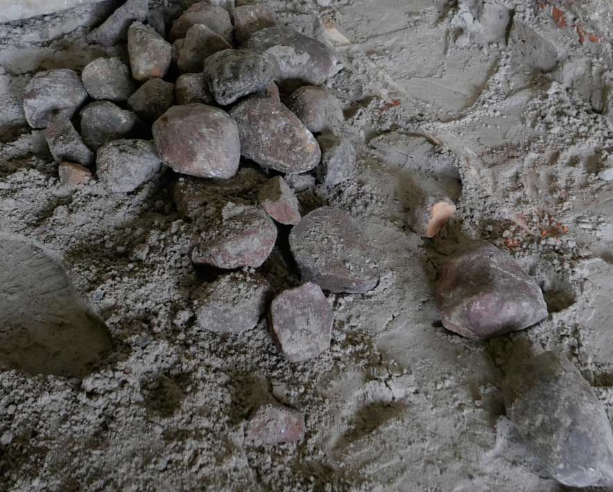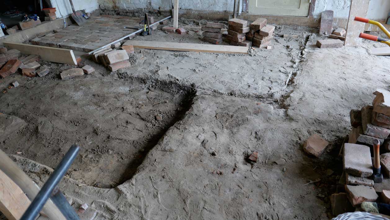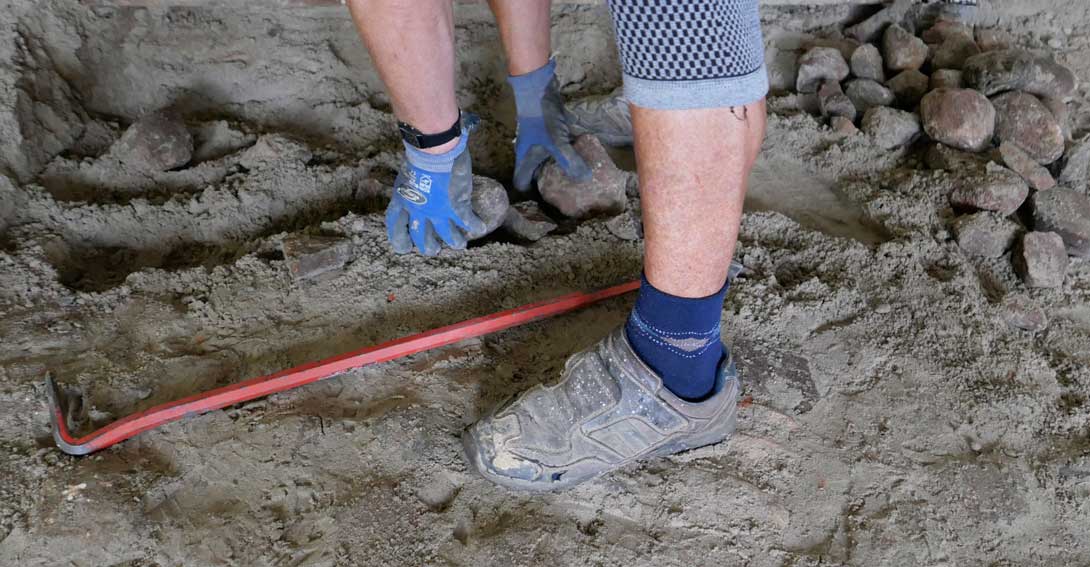 Es sind dieselben Steine wie zuvor am selben Platz nur neu verlegt. Jetzt tiefer, damit die Balken unter den Mauern freiliegen.