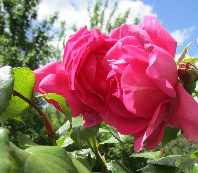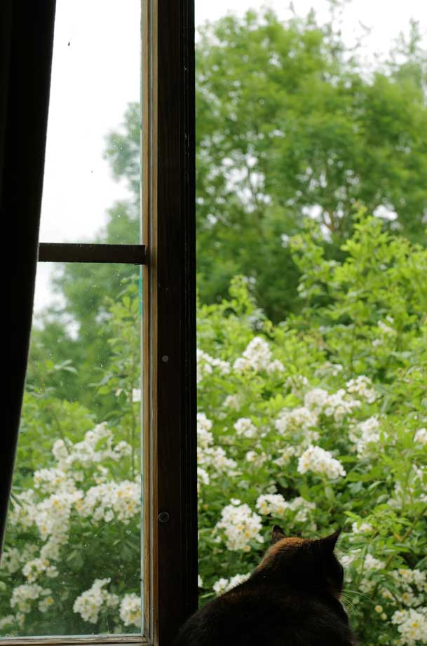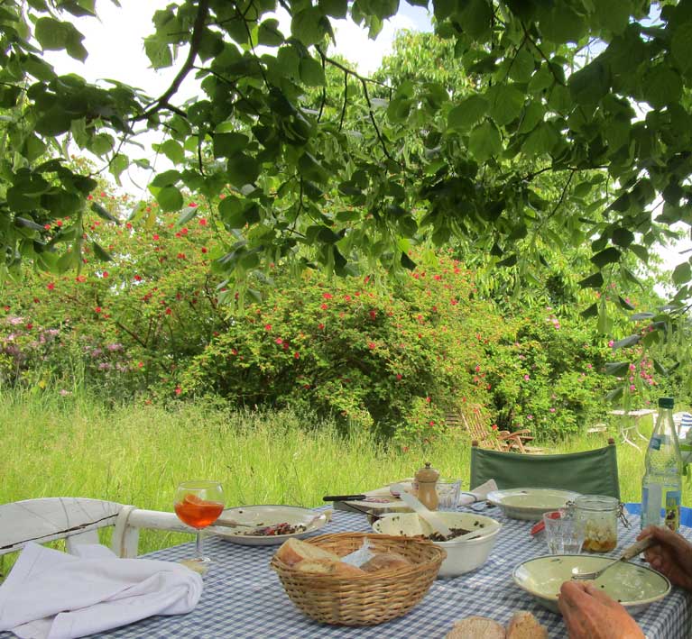 wir hören das Summen der Bienen in den Rosen bis weit an meinen Tisch
