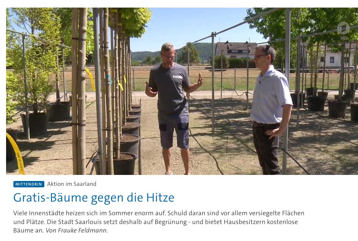 Einen Baumverkäufer mit kurzen Hosen des Sommers 2022 hilflos als wolle er sagen: was soll ich machen, in einer mit Platten versiegelten Gärtnerei und Bäume ohne Äste und Blätter, da wo sie Schatten geben sollen, nach EU-Baumschutz-Ordnung gestutz und befestigt. Gratis. Ein Witz. Sempe der Karikatuerist von Witzen aus Frankreich gestorben. Wir haben nun nur noch das Foto dazu.