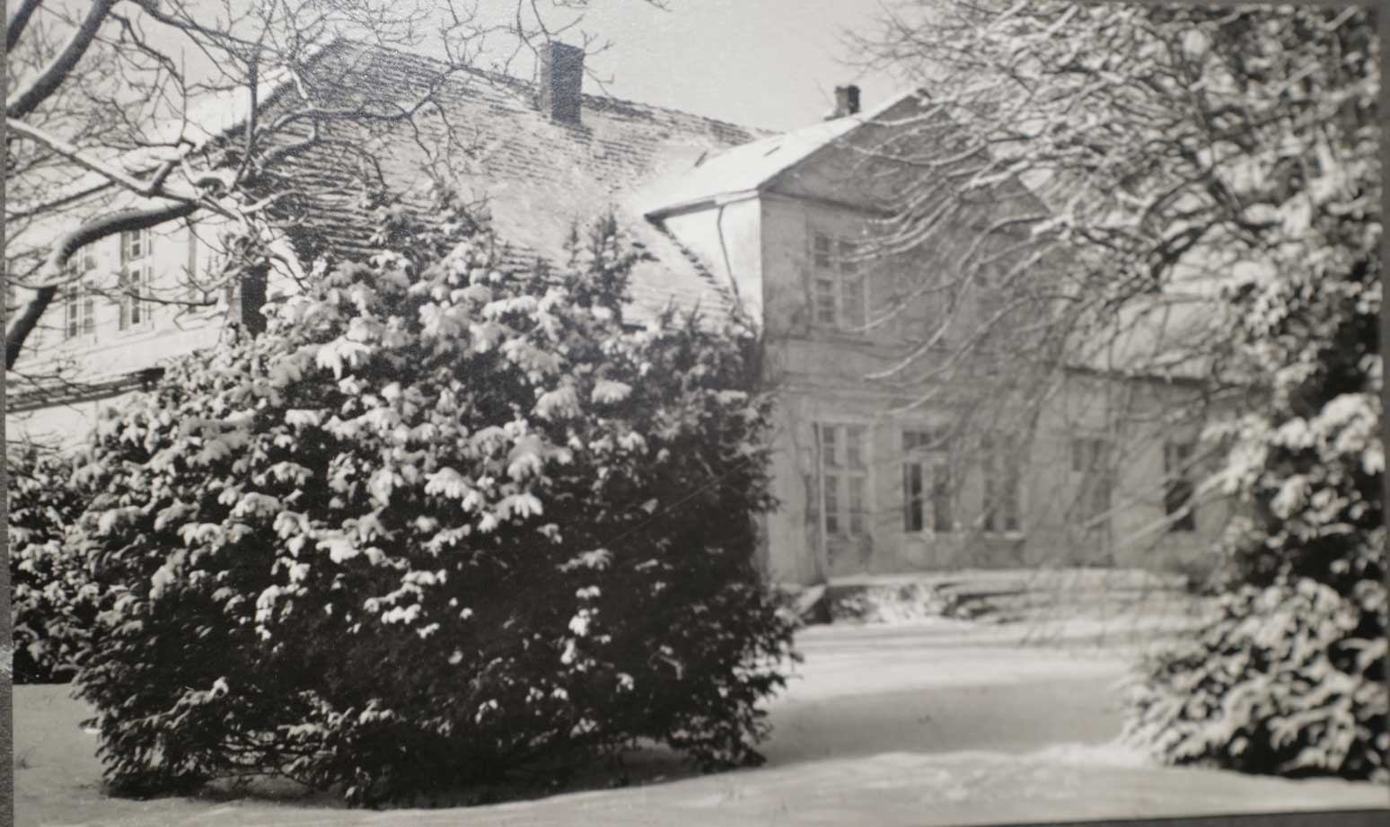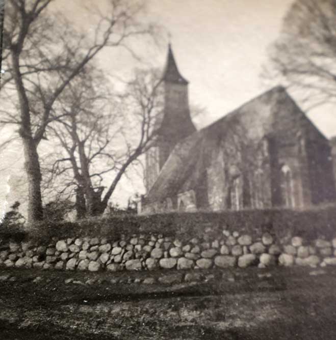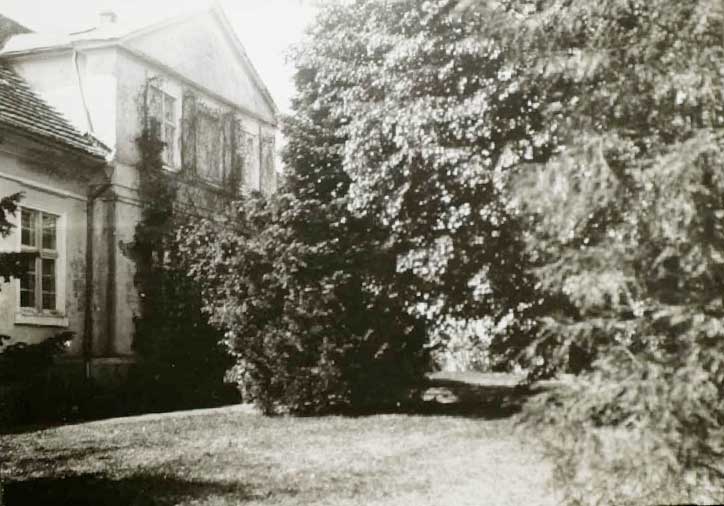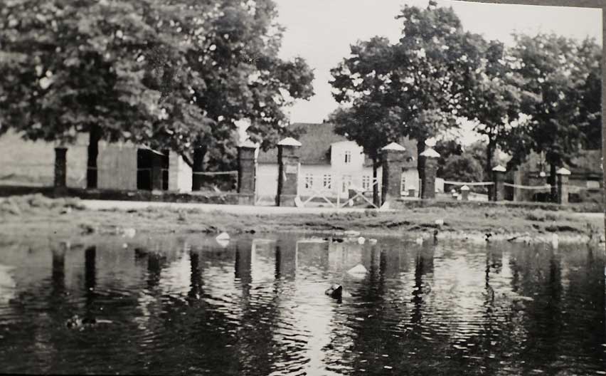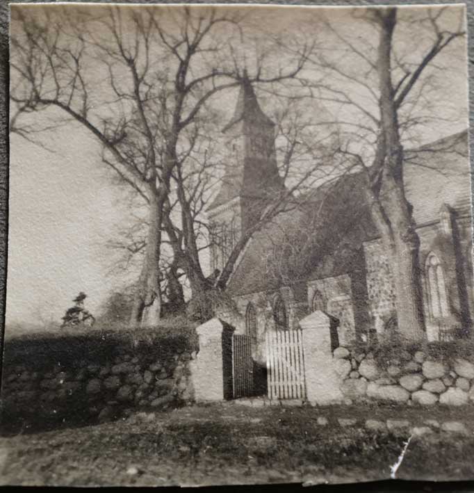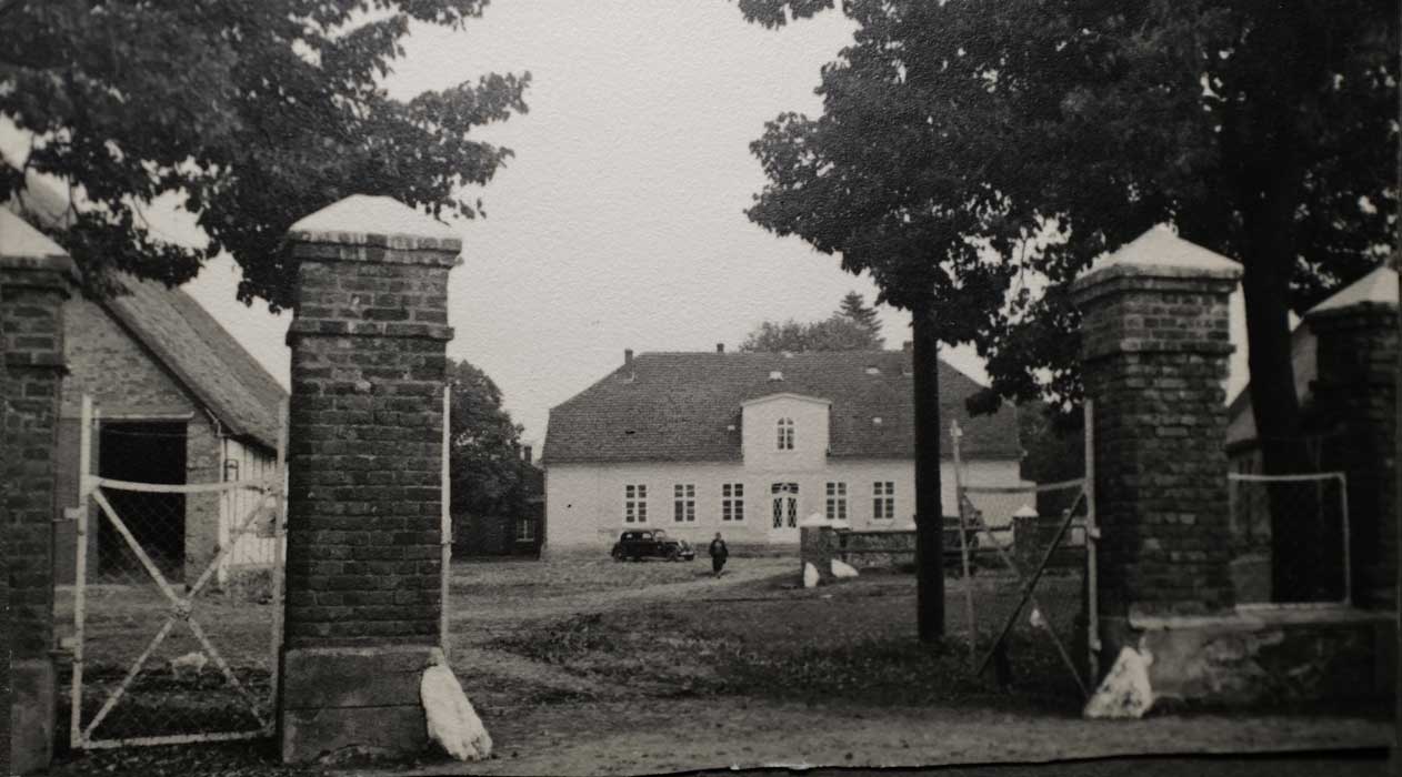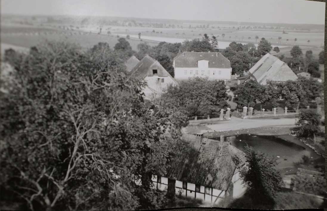 Der Weg vom Feld mit Feldscheunen hinten -heute das neue Dorf der Plattenbauten- und dazwischen der Gaben. Der alles einfasste Haus und Park mit Garten, Koppeln und Kirche.