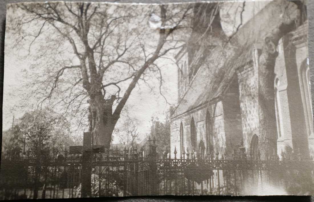 In das Gitterwerk der Gräber unter der Linde des Turms.