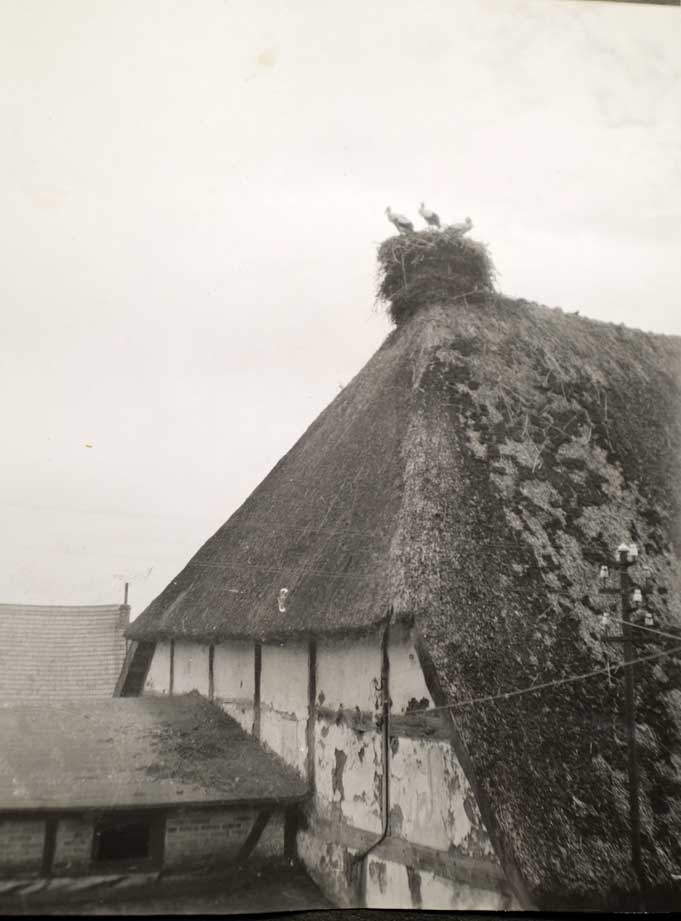 Das dem Sohn Alfred Krüger gewiedmete Haus damals als Fachwerk- Urhaus des Dorfs, aber schon mit Dach aus Blech. Und Anbau links.