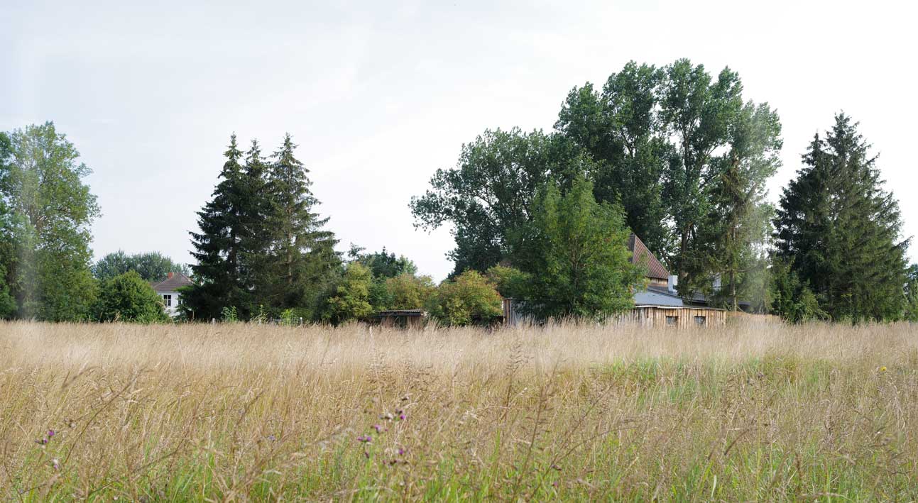 A-Haus zusammen über die Blühwiese zu sehen