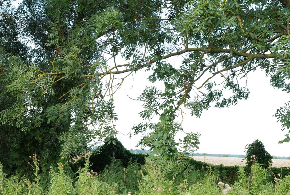 Da sehen wir auch wie weit die Weide sich hinauslehnt über den Graben und hin über den Grünstreifen, den die EU nun verschreibt als Abstand vor den Gewässern, auch zur Erhaltung der Insekten und sonstigen Tiere. Gut, wenn man die Bäume auch so lässt.