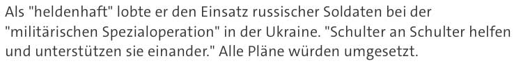 Als "heldenhaft" lobte er den Einsatz russischer Soldaten bei der "militärischen Spezialoperation" in der Ukraine. "Schulter an Schulter helfen und unterstützen sie einander." Alle Pläne würden umgesetzt.