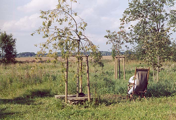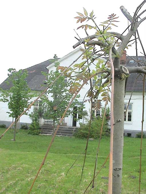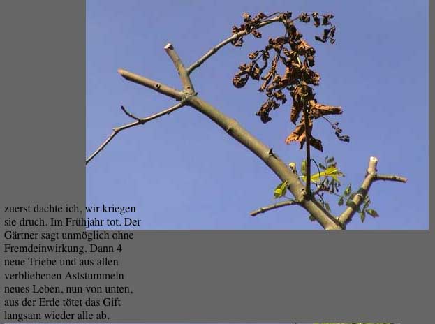 Was eine Traueresche war nach den Bildern von Früher wieder und als Erstes gepflanzt, am alten Platz, Zentrum ersten Lebens, vergiftet und durchgebracht