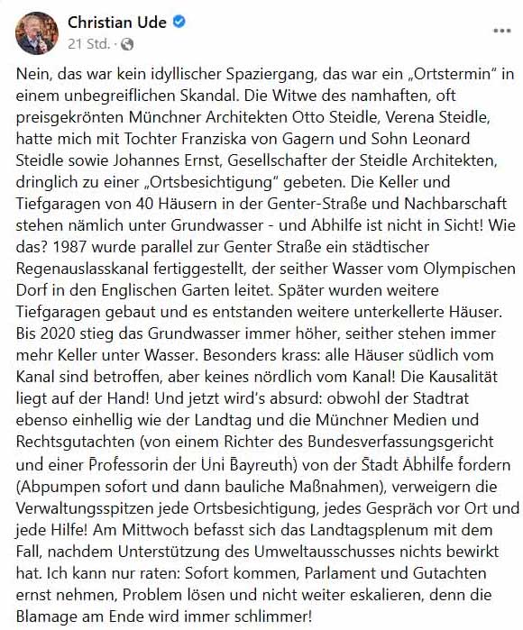 In München weiter Hochwasser in den Kellern. Alle Parteieen toben, alle Medien sind empört, seit nun 2 Jahren ohne Bewegung der Stadt, die hier zuständig ist, von technischen Gutachten aufgerufen, durch Anwaltshilfen gefordert. Nun also der Ex-Oberbürgermeister U. der ein besserer war und Freund der Künste von Geburt.
