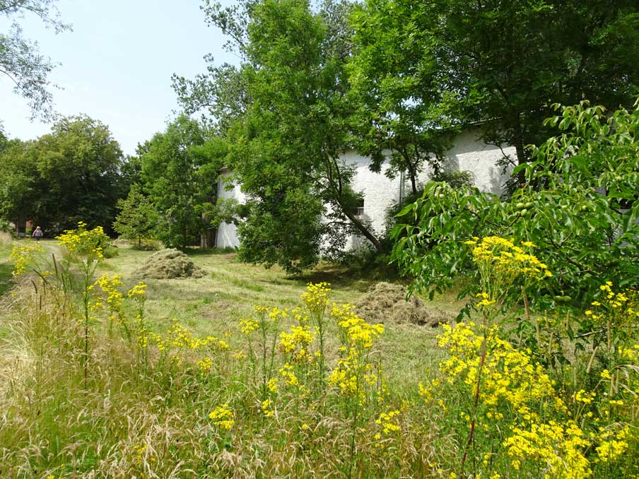 Ein Steinweg auf das Haus zu aus dem Pflaster, links und rechts steht das Gras hoch und den Vögeln freundlich