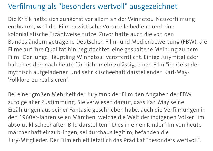 Für Ernst Bloch war er ein Held seiner Zeit. Sein Handschlag kam in dem Moment, als der Richter in unserem Film zu Karl May ihn mit diesem Urteil freisprach. Denn auch in seiner Zeit war er den Schulen verdächtig, weil er Kinder verderbe. Also ein aktueller Fall. Was eben noch in den Klippen der Vergangeheit verkam, wird nun zum Kampfobjekt - von immer denselben, heute der Demokratie.