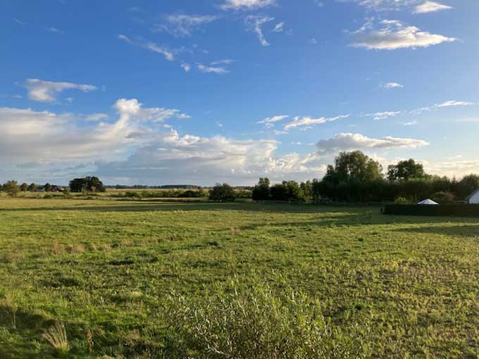 Die Koppeln gemäh† und die Felder bestellt bis zum Wald. Ein Brücke zum Weg an dem Graben entlang. Der Kastanie mitten im Bild geniesst sichtbar gerechte Freude. Bald mit Früchten im Hauses hier. Für den Winter zu wärmen den Rücken.