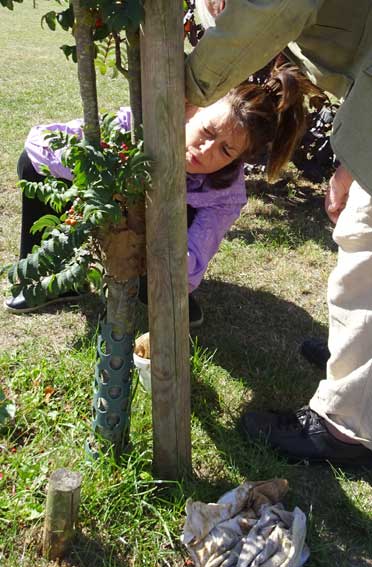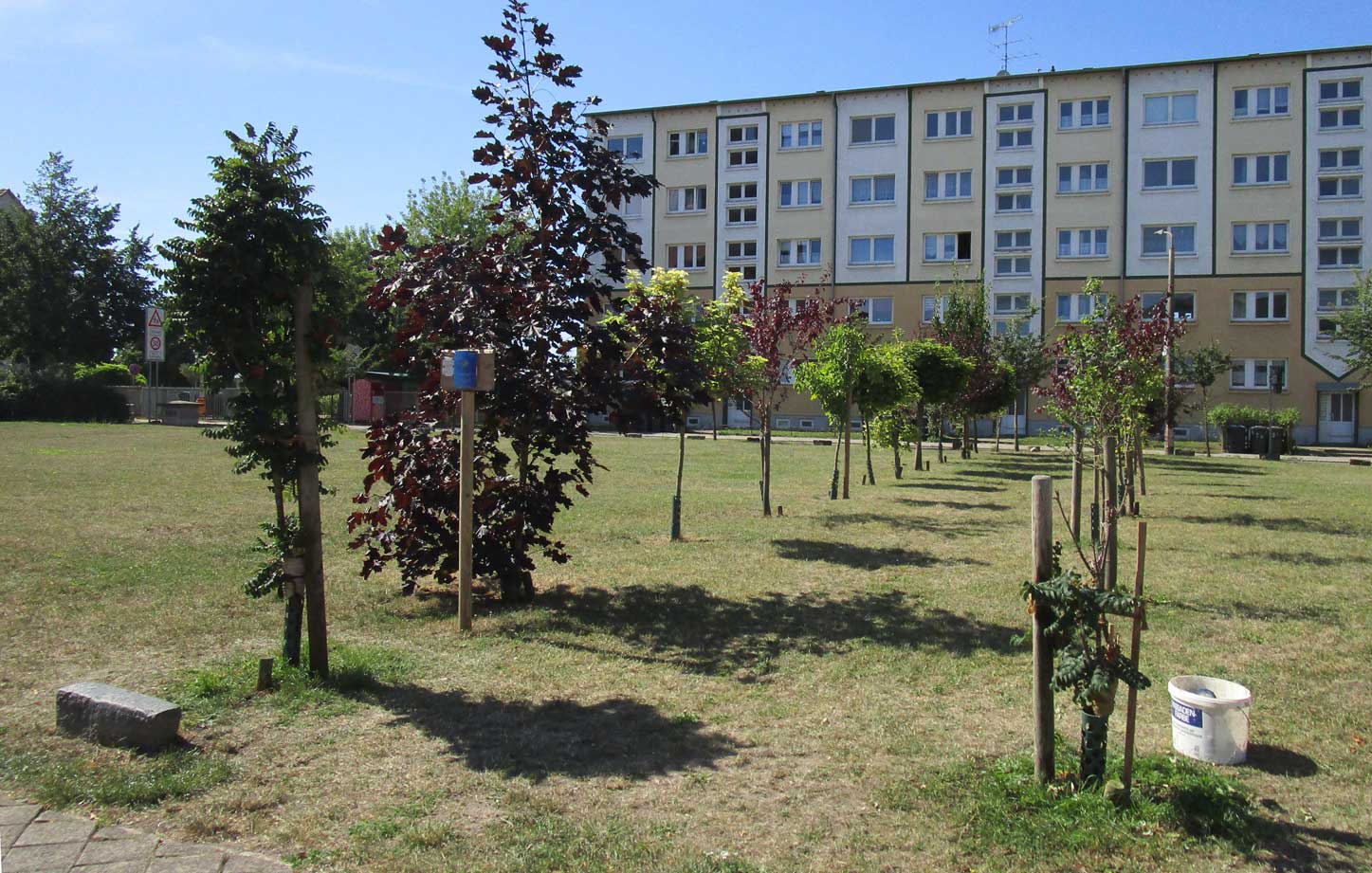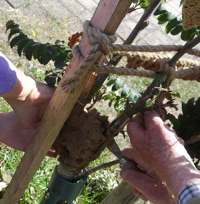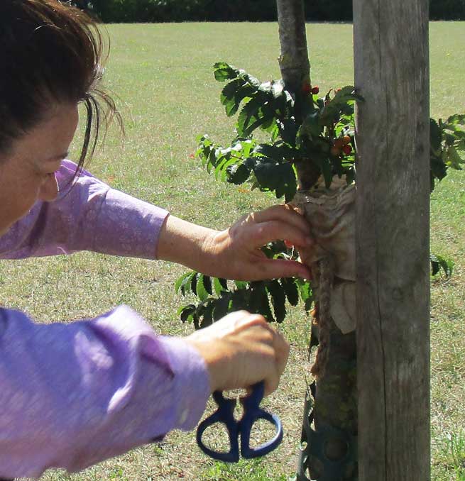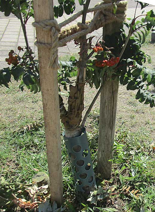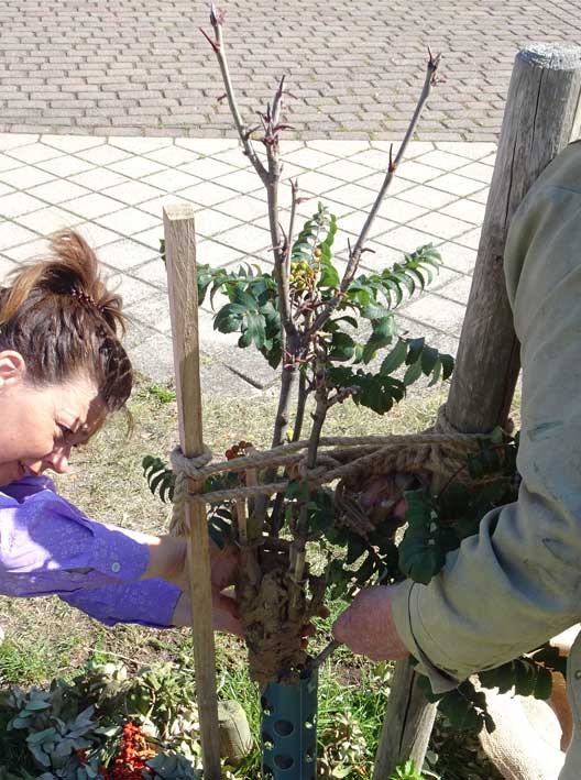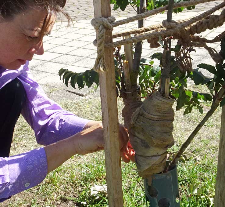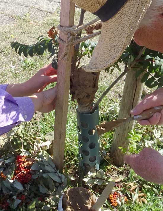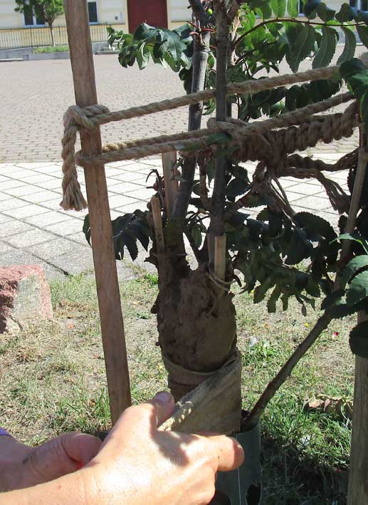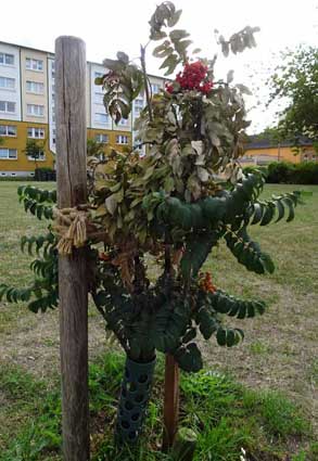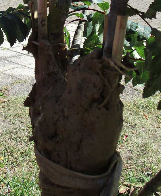 Die Esche links vorsorglich auch mit erneuertem Verband.