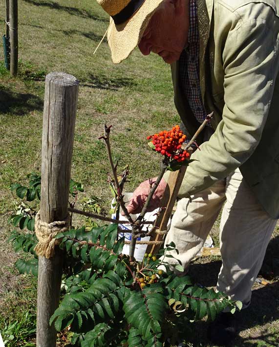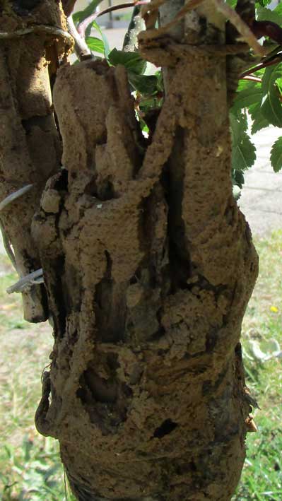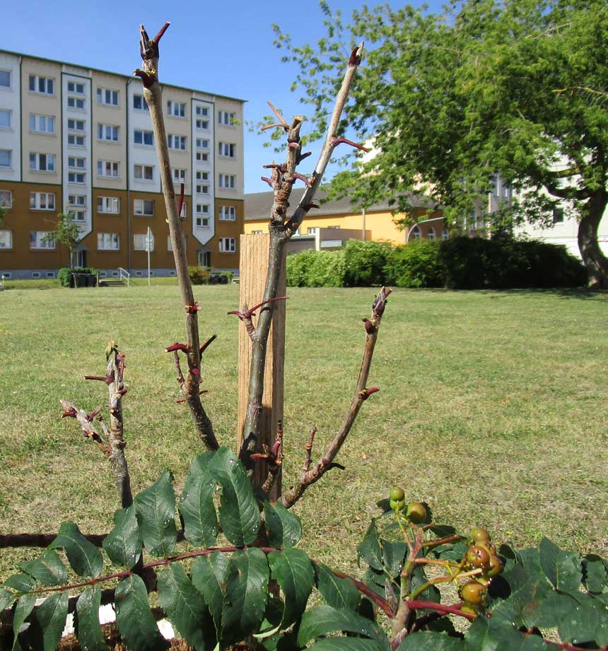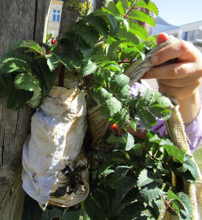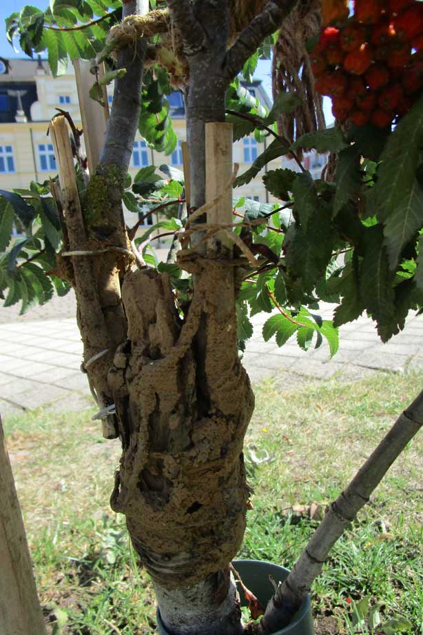 So sieht es aus, wenn der Verband abgenommen ist. Brüchig der Lehm und ausgewaschen, ohne Heilwirkung nach der Trockenheit der letzten Tage. vertrocknet die oberen Blatter und Beeren. Die Äste nach oben auch?