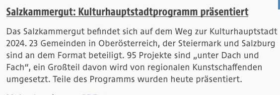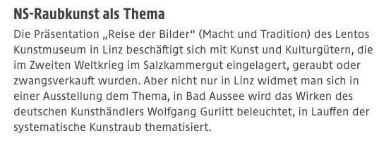 Das mittelalterl. Salz-Kammer-Gut, zuletzt bekannt als Panorama von Leharoperetten und Heimatfilmen, nun im Fokus der Raubkunst-Standorte. Warum, als Bergungsziel für Linz als Hitler-Museum, dem Hort der geistigen Reichs-Kleinordien des Kontinents in der Alpen-Festung.