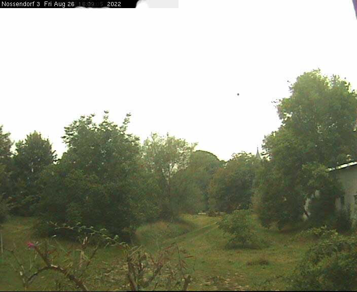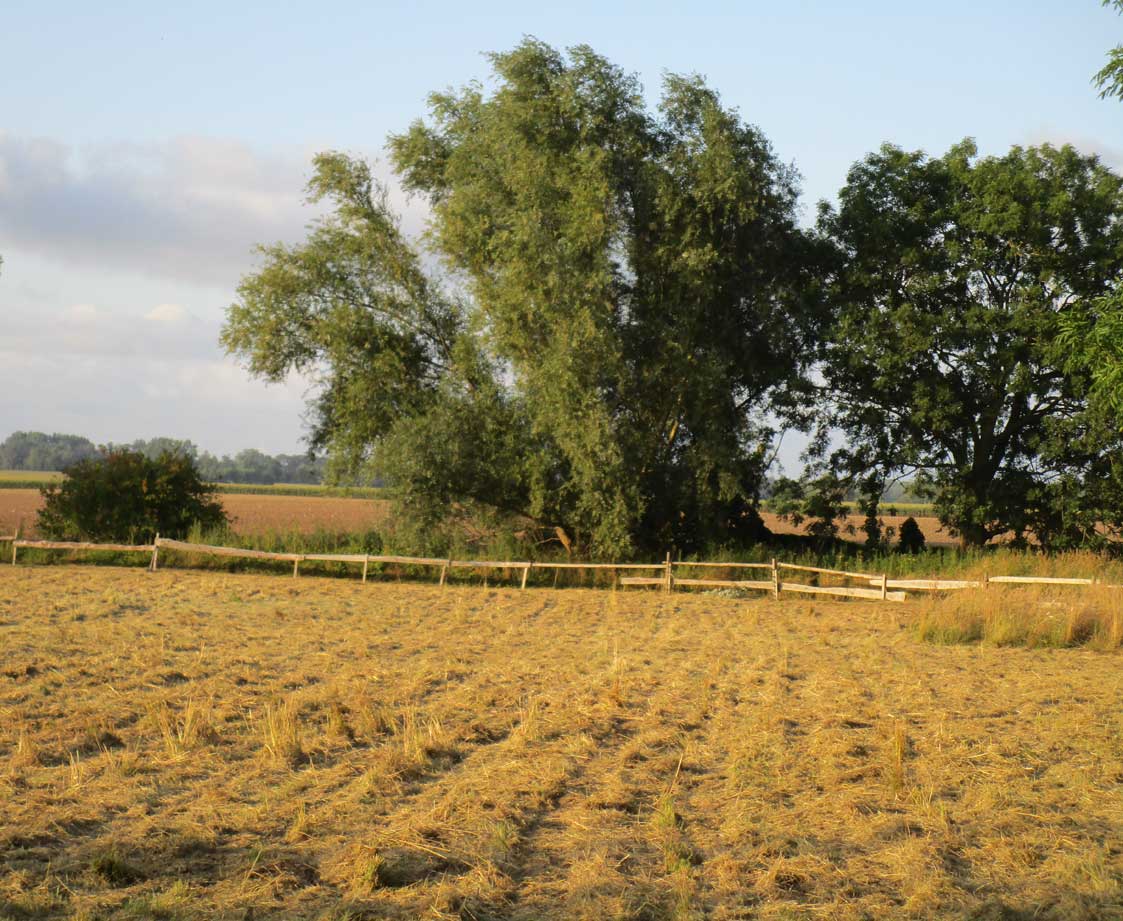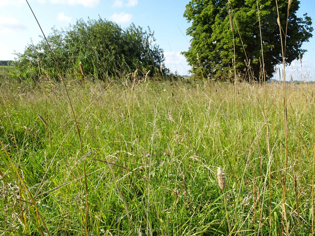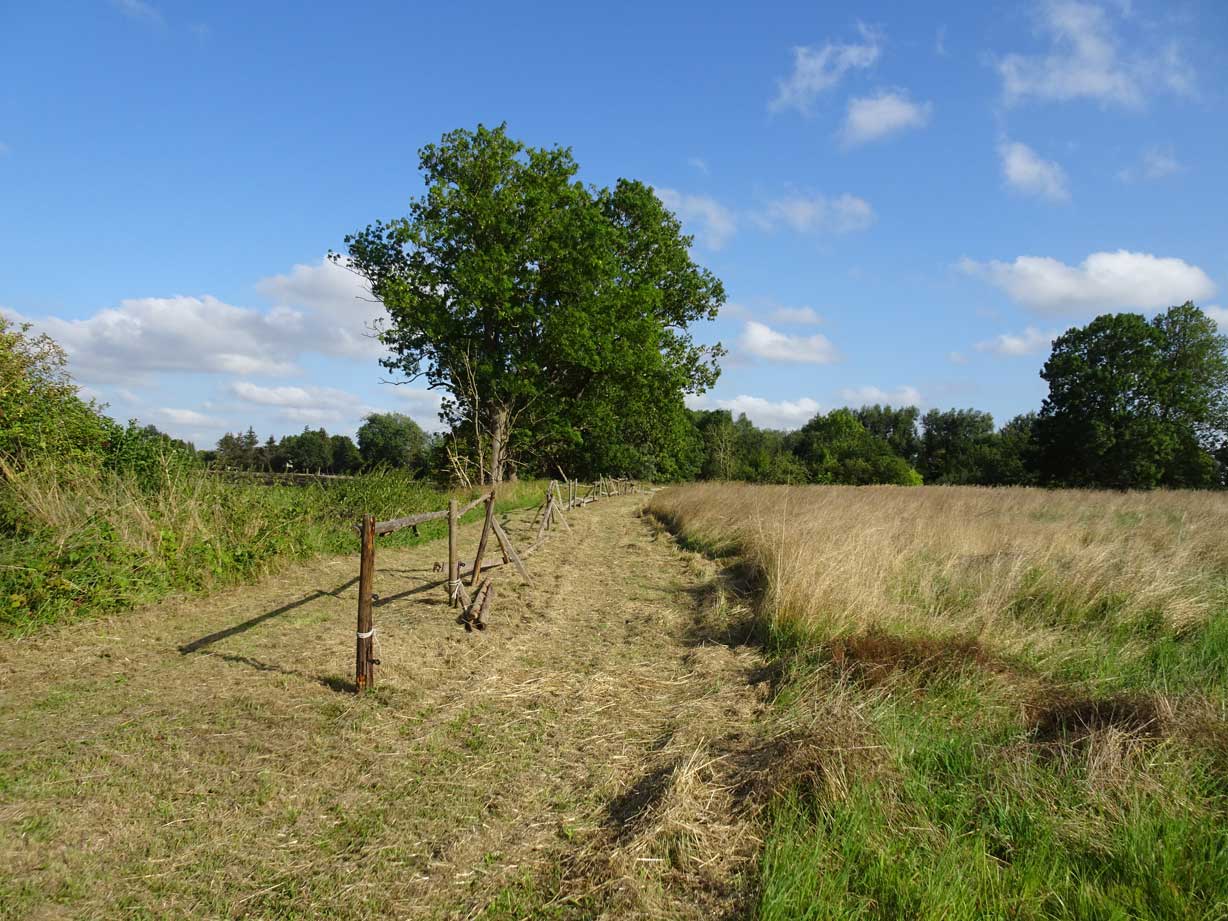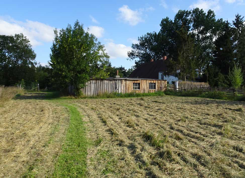 Die Brücke da hinten über den Graben zum Weg über die Felder ist noch nicht freigemäht.