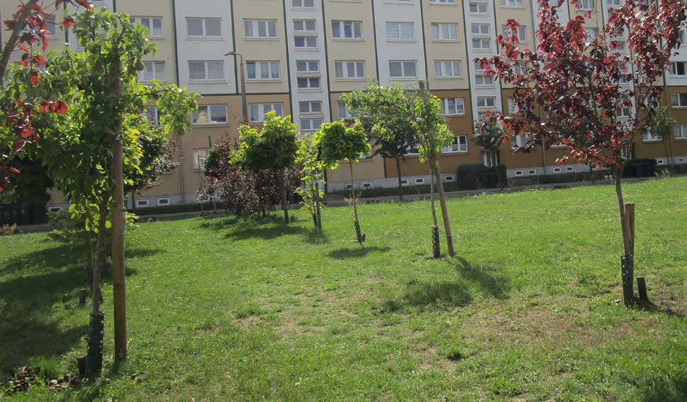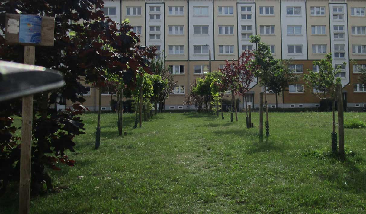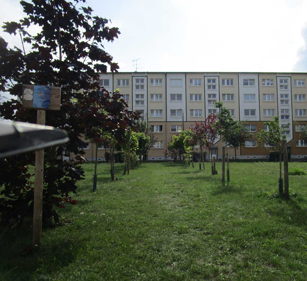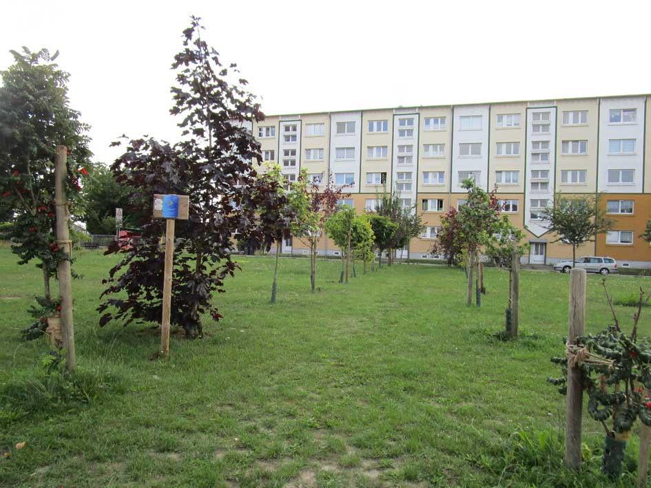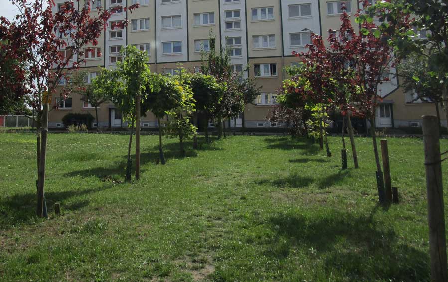 Es ist eine Doppelreihe von 24 Bäumchen, die in der Höhe von Menschengrösse angelegt sind, was darüber wächst, wird man schneiden. Wie hinten links demnächst. Alles zu Durchgegen geeignet . Ud als Gedenk-Ort für das und die, die da waren.
