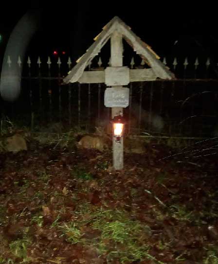 Aus Nossendorf geschickt, es brennt das Licht am Platz der Wahl unter weit her gekommenem Kreuz, wieder. instand gesetzt.