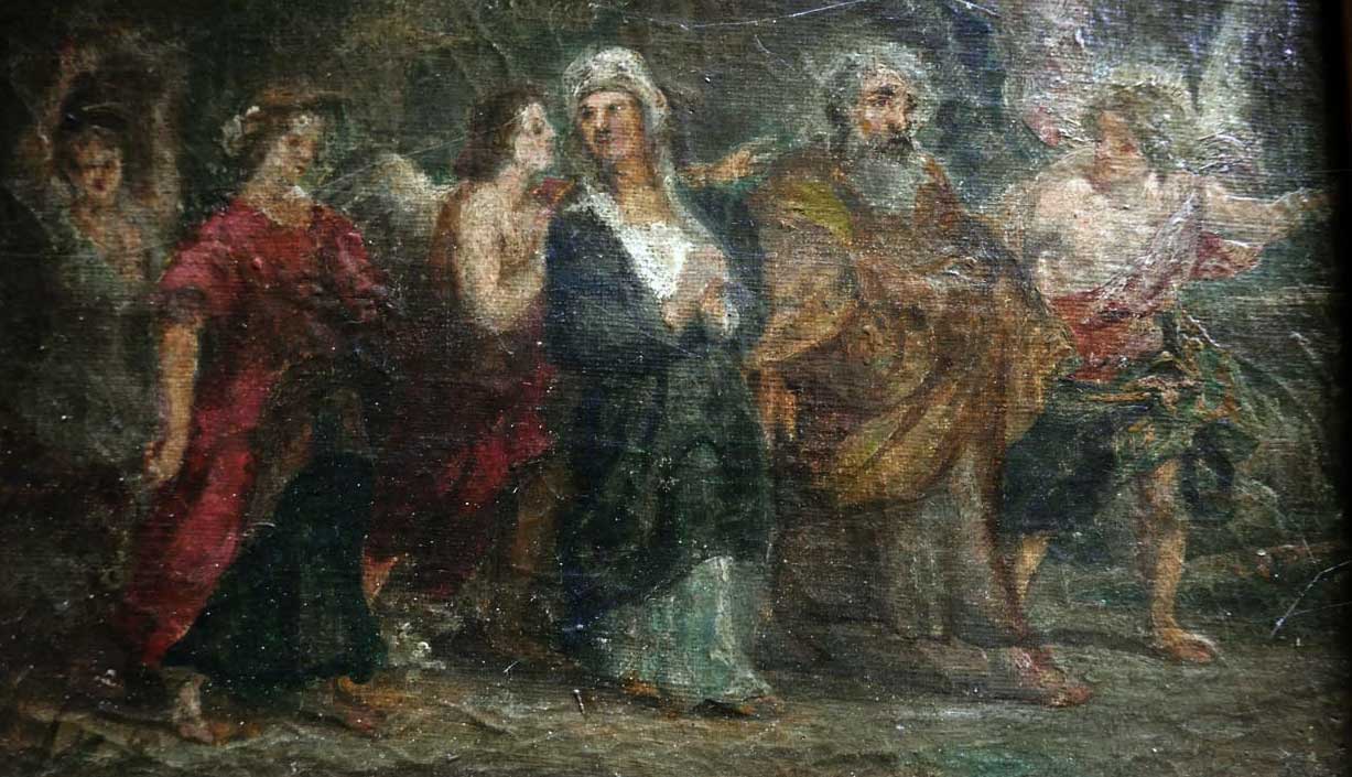 Aus dem Schlafzimmer hier am Tisch das Bild zu Sodom und Gomora.Vertreibung, hinter ihnen brennt die Stadt. Vom Engel geleittet, die Frau, die sich trotz Verbot umwendet, hat keine Chance...Von M.K überlassen .