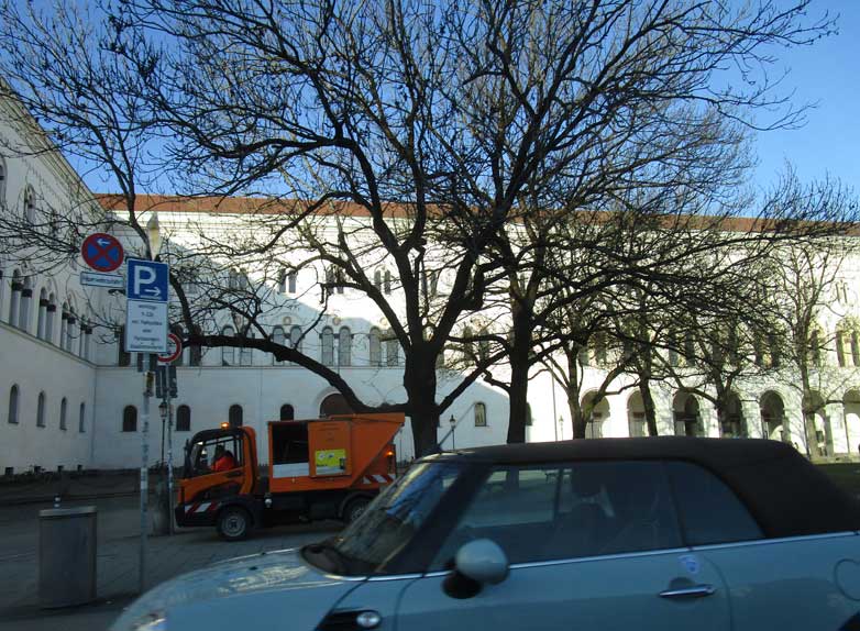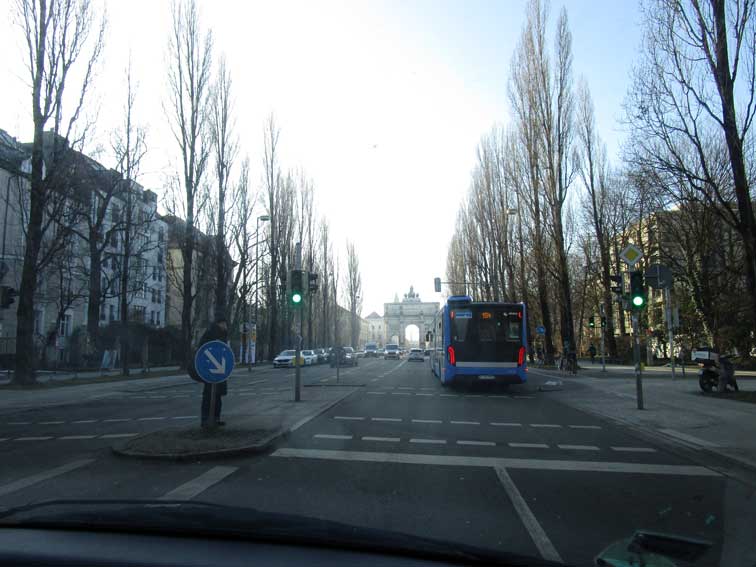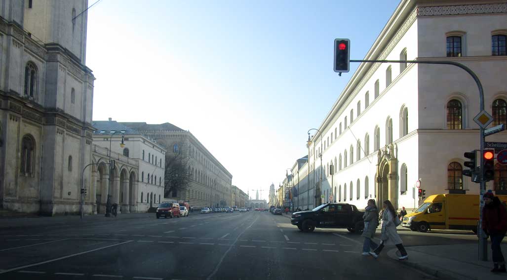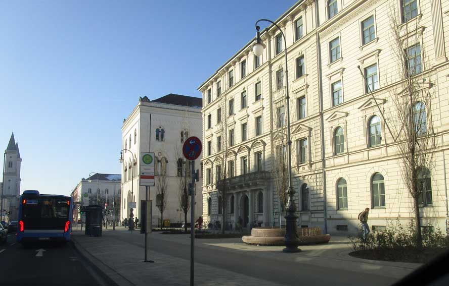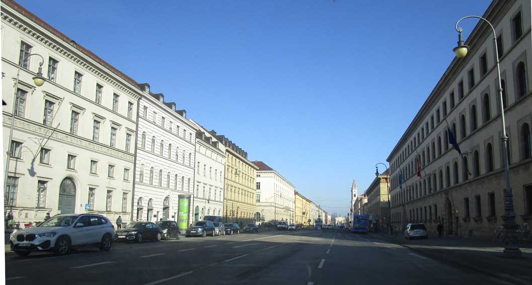 Ludwigstrasse von Süden und Leopoldstrasse Schwabing mit Pappeln und Bänken: wie man das macht. Ohne Wettbewerb und wenn man es seinen Gästen bequem machen will. An langen Strassen und Promenaden, Demmin augepasst.