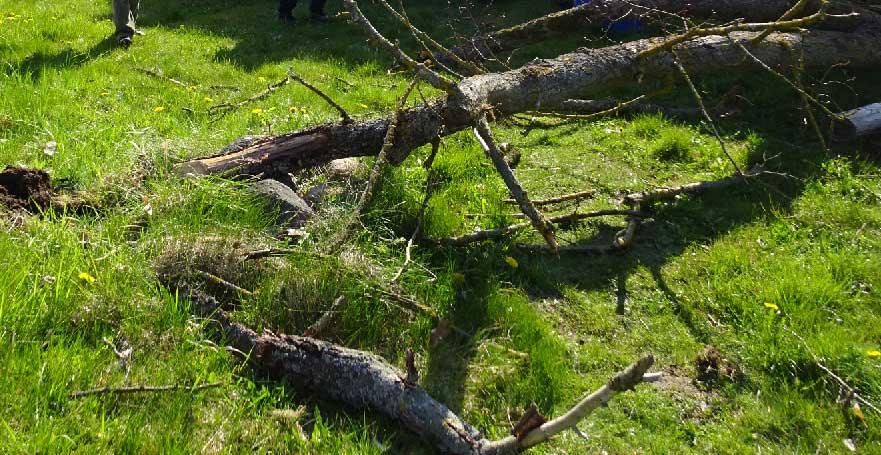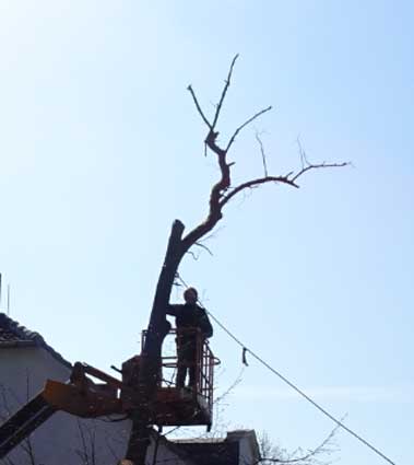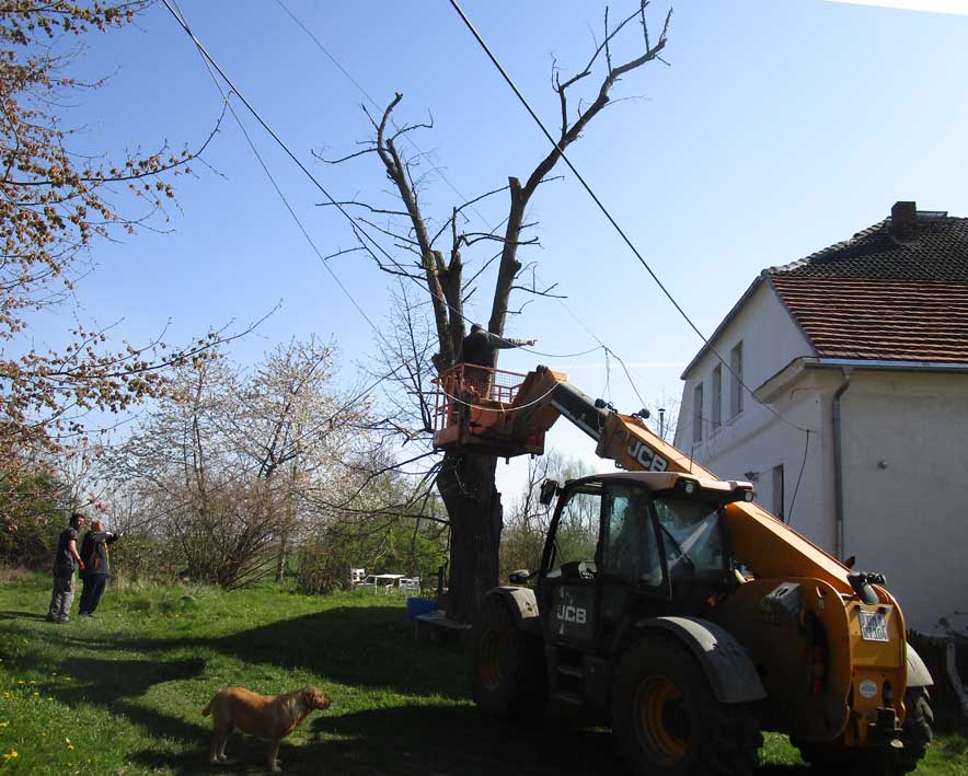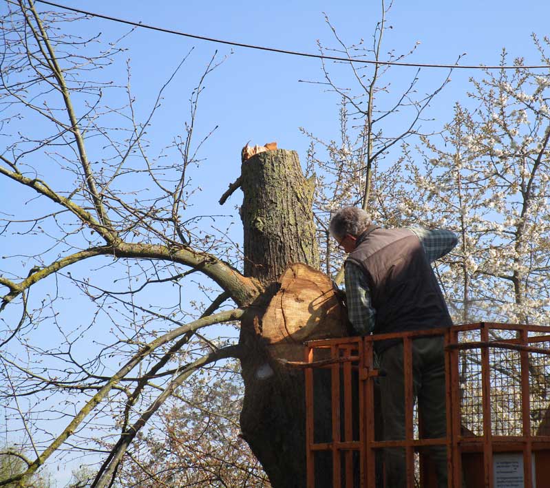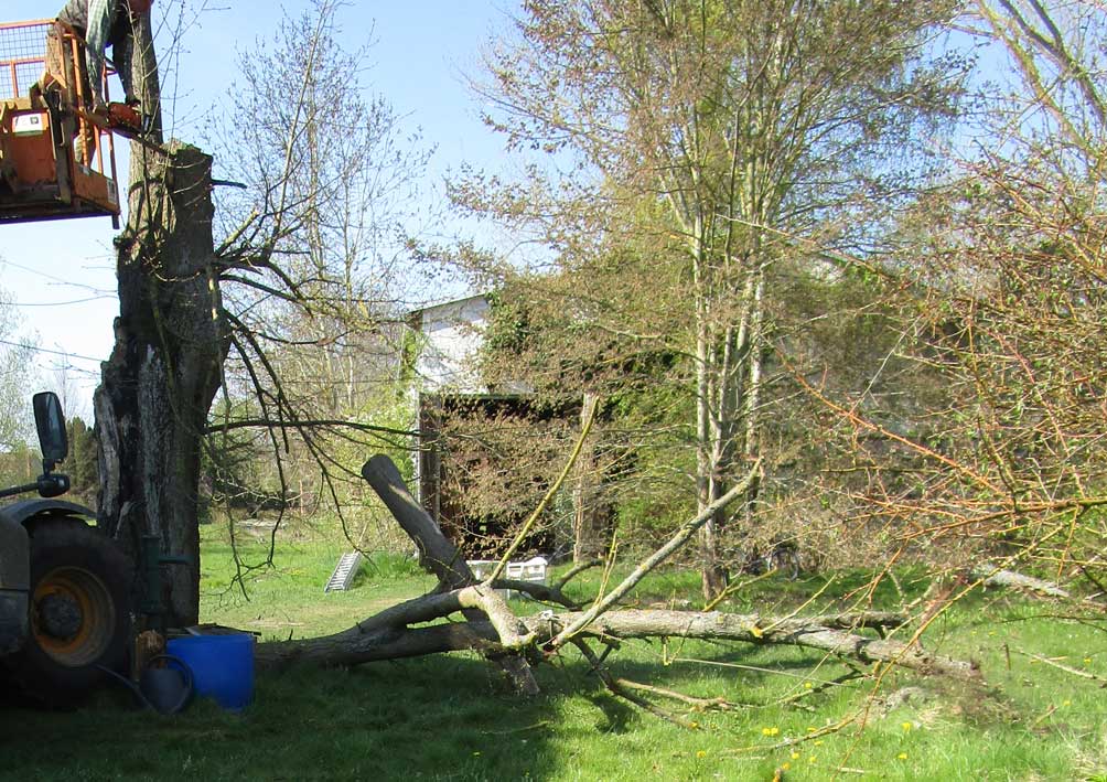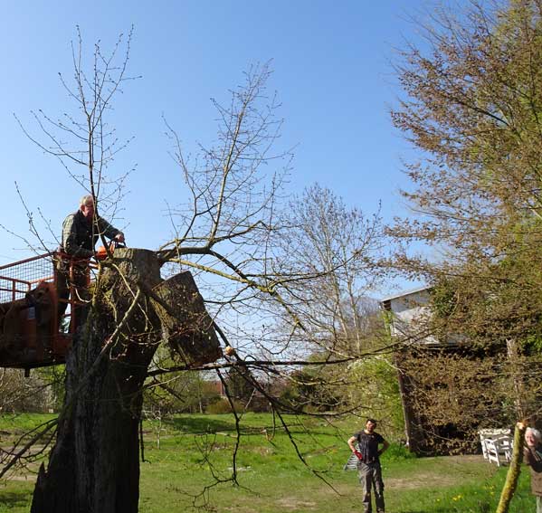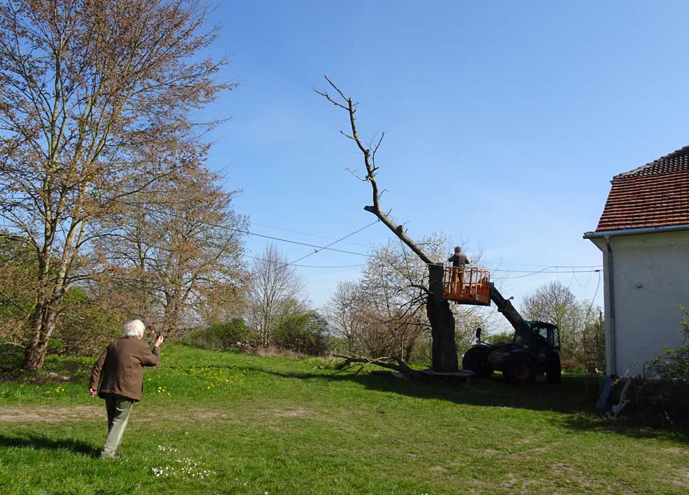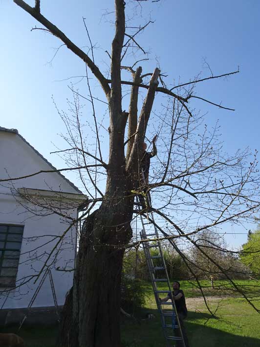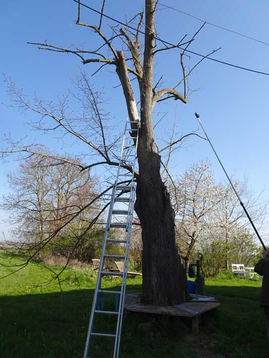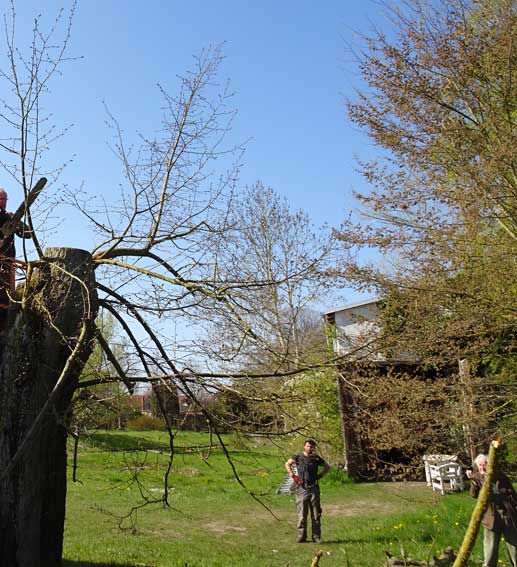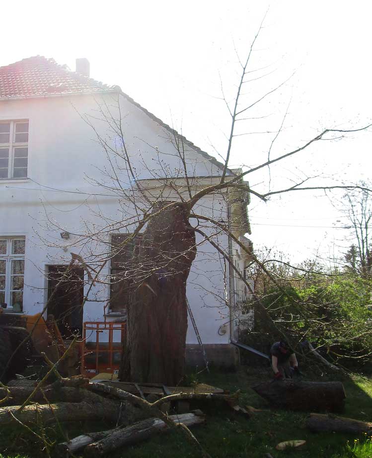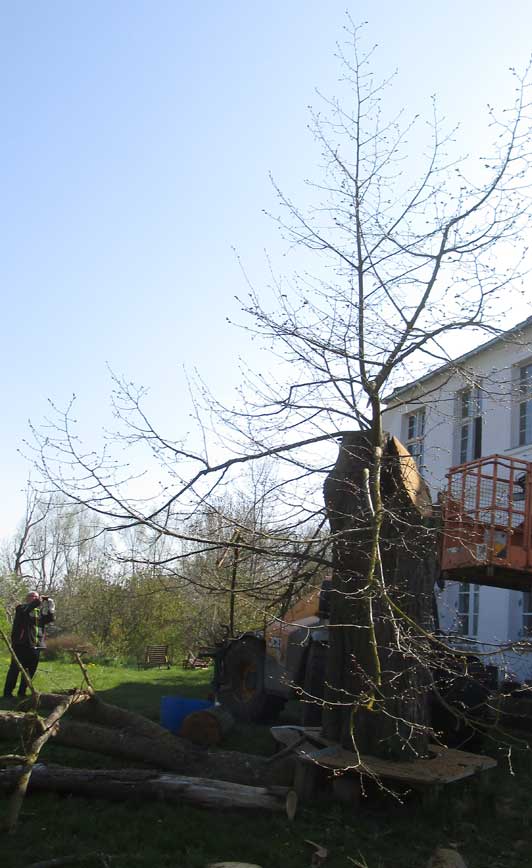 Da sind die Leitungen der Turm- Kameras, wohin nichts fallen darf, die zarten Triebe unten, für die der obere Teil nun runter kommt. Und da ist das Haus so nah. Nachdem der andere Teil im Sturm das Dach schwer getroffen.