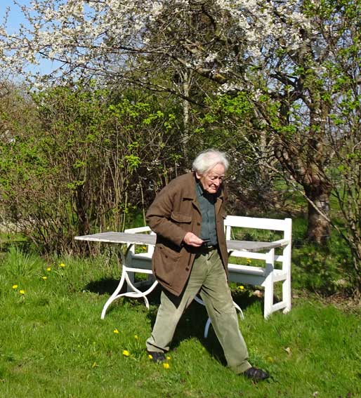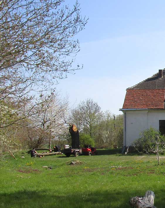 Am Morgen. Unruhe der Nacht davor. Die Linde am Haus, einzig von vor 1945 Überlebende hier auf dem Hof und im letzten Herbst vom Sturm gespalten, soll nun ihres oberen Teils entledigt, als Sockel stehen bleiben ohne Beschädigung der neuen Knospen unten. Mit grossem Bedenken, ob das gelingt.Wird sie das überstehen. Und wie wir. Am Kücheneingang, zentraler Ort. Sitzen im sommerlichen Schatten. Nach Verlust der Ställe und aller Bauten rundum.