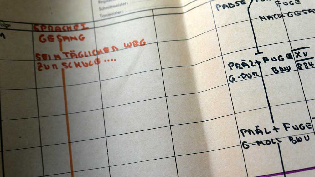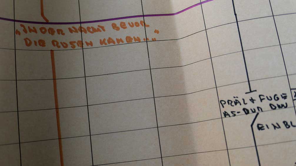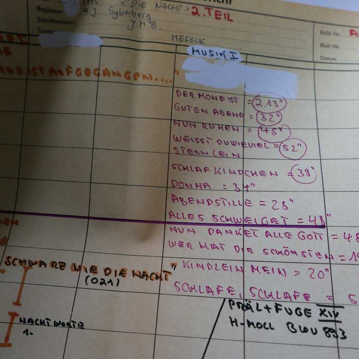 in den erhaltenen Mischplänen sieht das dann so aus wo die sonst vielen Tonebenen zu en Bildern zusammengeführt, überlagert und ineinander übergehen. Hier in Der Nacht nur die Fugen von Bach alle 4 Stunden des Wohltemperierten Klaviers plus Abschied von RW. Eine einfache Linie des Auf und ab um die Worte eines Monologs von 6 Stuanden . Vorher im Film, den wir Hitler aus Deutschland nannten, war das ein 7 Stunden Tonepos von vielen Ton-Bändern um-und ineienander.
