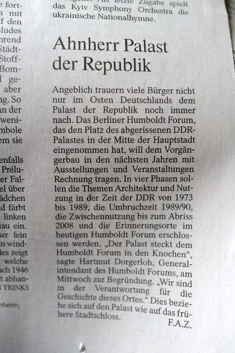 Der sogen. Palast der Rep. enstand aus dem Sieg Stalins und der SU und unserer Vasallen, wie wir sie jetzt in der Ukraine täglich besichtigen können. Auf dem Grund unserer Geschichte aus Jahrhundertengehört das nicht. Es gibt keinen Grund dieser Vernichtung aus eben jener Untaten anders zu gedenken als mit Scham und Abscheu. Von der SU zu lernen wie man siegt ....
