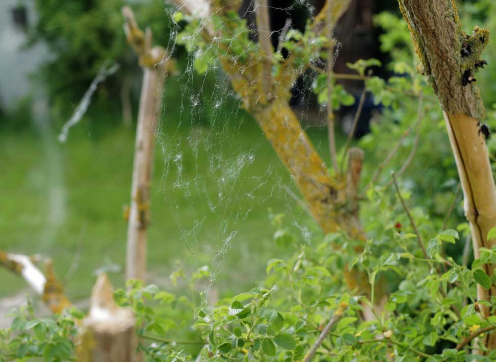 die Samen der Pappelblüte im Netz der Spinne des Morgens