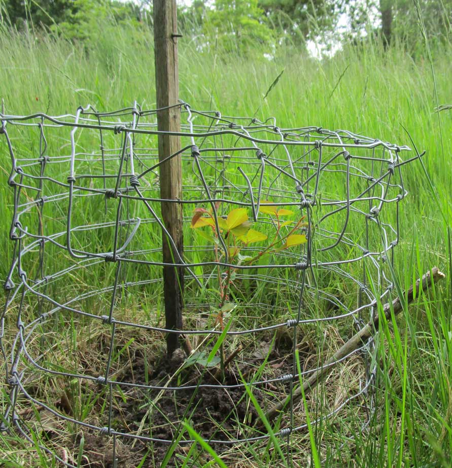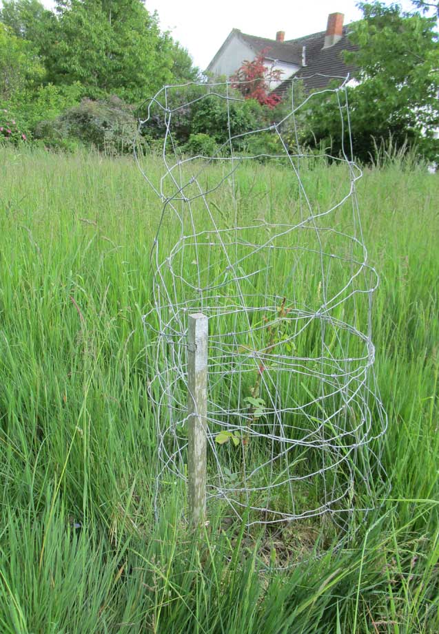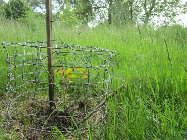 erste Spuren zeigen die Gefahr am Verbiss der KeimBlätter, die Drahthüllen aus dem Bestand voriger Jahre.
