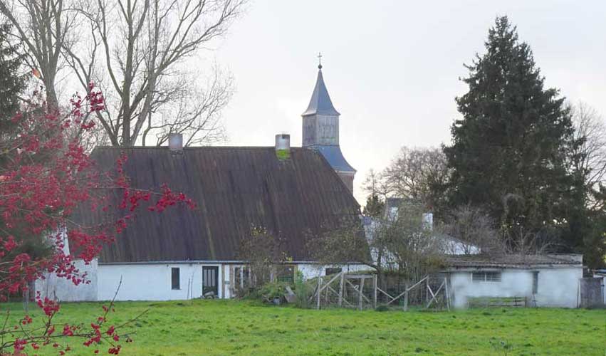 Auf der Koppelseite werden wir mit Schalbrettern eine natürliche und dauerhafte Holzverkleidung versuchen, auch um uns vom Weiss am Haupthaus abzusetzen. Ähnlich dem Kirchturm mit schmalen Leisten über den Spalten der breiten Deckbretter.