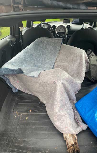 Das alte Kreuz geborgen in grauen Decken verpackt ab nach dem Norden. Dies Grundlsse, Fluchtort aus N. nun nach N. zu bringen.