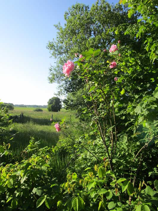 noch im Schlaf, der Pfad, links und rechts die Rosen bald offen