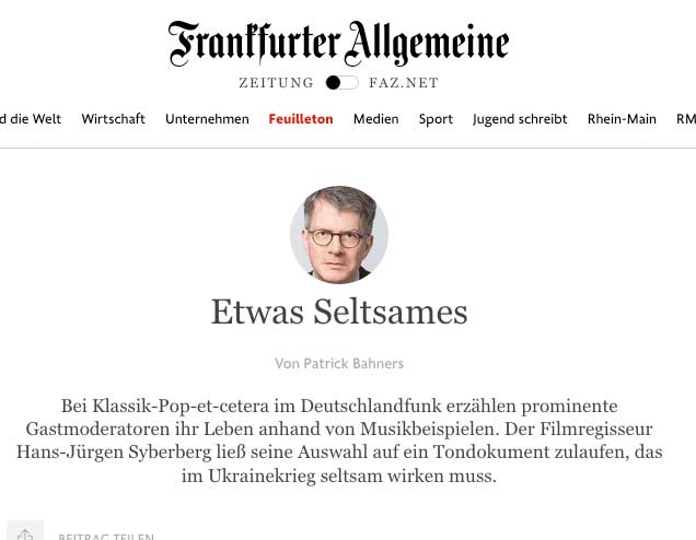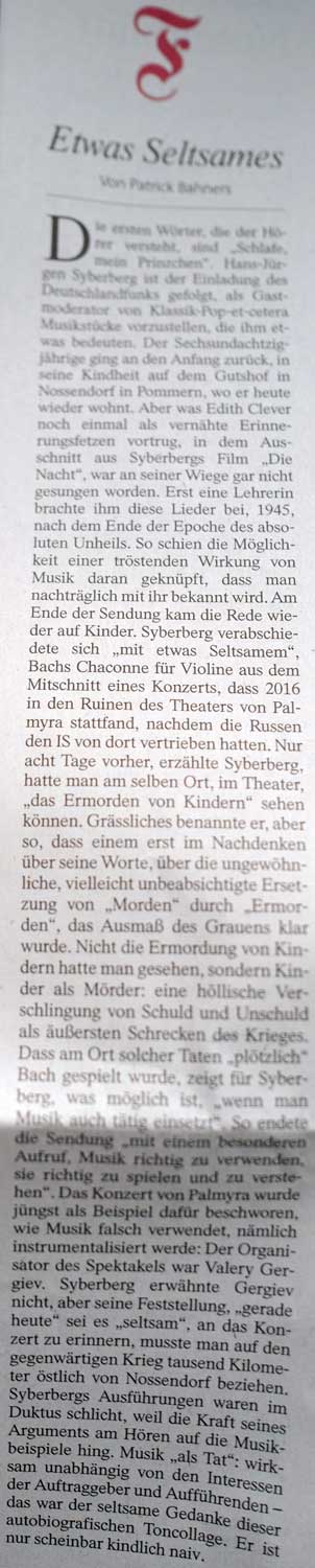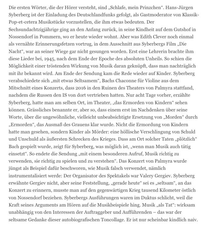 Hier nun im Radio am Ende dieses Weges durch die Filme des Lebens mit Musik, aus der damaligen DDR Brechts und Felsensteins kommend und oft mit Musik von Svatoslav Richter aus Moskau, wenn er das ganze Wohltemp. Bachs spielt. nun in Die Nacht, nach Amon Düül mit Motorrädern in Kleistschen Geschichten durch Bayern und einem jodelnden König aus Bayern als Wierdauferstehungs-Musik. Aber das interessierte den Berichterstatter in der FAZ weniger. Sein Interesse gilt dem Ende des Parcours nämlich das auch zitierte Konzert in Palmyra nach seiner Befreiung von den Terroritsten, die dort noch eine Woche zuvor am selben Ort, auf der Bühne des antiken Theaters Gefangene durch Kinder mit Genickschuss öffentlich per Inernet erschiessen liessen. Nun das Konzert Gergievs an eben diesem Ort.