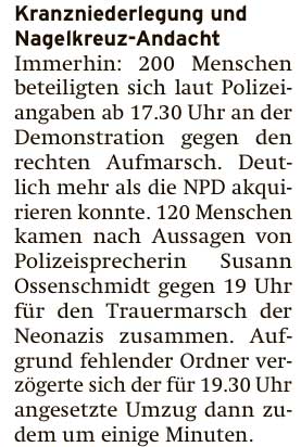 Am Ende des Abends, hören wir, kreisten Hubschrauber über der Stadt und von irgendwo klang es wie das Requiem von Mozart, vielleicht auch aus einem geöffneten Fenster, wie von damals vor 4 Jarhen in St. Bartholomaei, dies alles abzulösen wie in letzten Jahren dann. Und wenns nur eine/r wäre, wärs schon gut.
