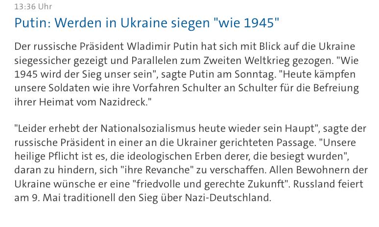 Heute werden sie wieder feiern in Moskau, weil ihre Truppen bis Mitte Europas gekommen waren -übrigens mit Materialhilfe aus den USA über Murmansk, den einzigen eisfreien Hafen im Norden, nun bis Berlin gekommen, wo sie auch noch lange standen. Gejubelt zu einer Befreiung hat da keiner. Zuviele Brandschatzungen und Schändungen und Morde mit Enteignungen und Okkupationsgebaren eines ganzen Volkes waren die Bedingungen und Folgen. Bis zum Mauerfall 1989. Das war nicht nur der Untergang des alten Europa und die wahre Katatstrophe seiner Geschichte hin zu ener neuen Selbstfindung bis zu zur neuen Invasion Russlands in Richtung Europa im Versuchen einer Zurücknahme eines retrospektiven Sowjetischen Imperiums. Und wenn sie heute reden von wieder Krieg in Europa, dann von aussen, denn ab nun ist Russland wieder ausserhalb, zu schützen uns gemeinsam von innen.