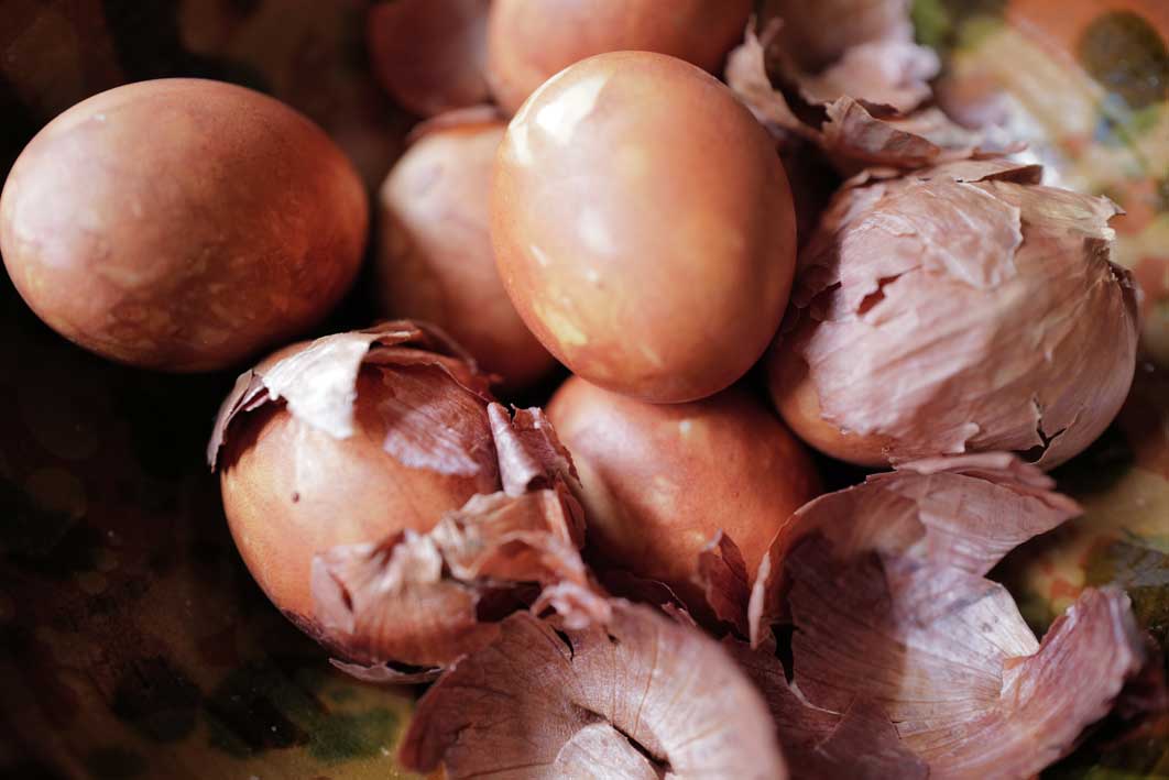 Die Eier in den Zwiebelschalen gekocht mit den Farben und Markierungen der Schalen in jedem Jahr anders.