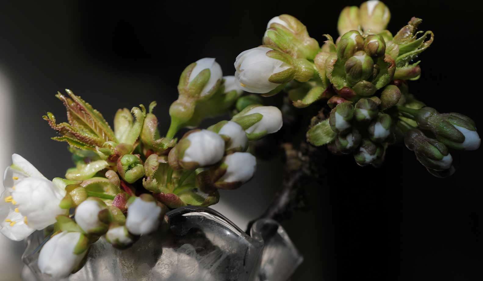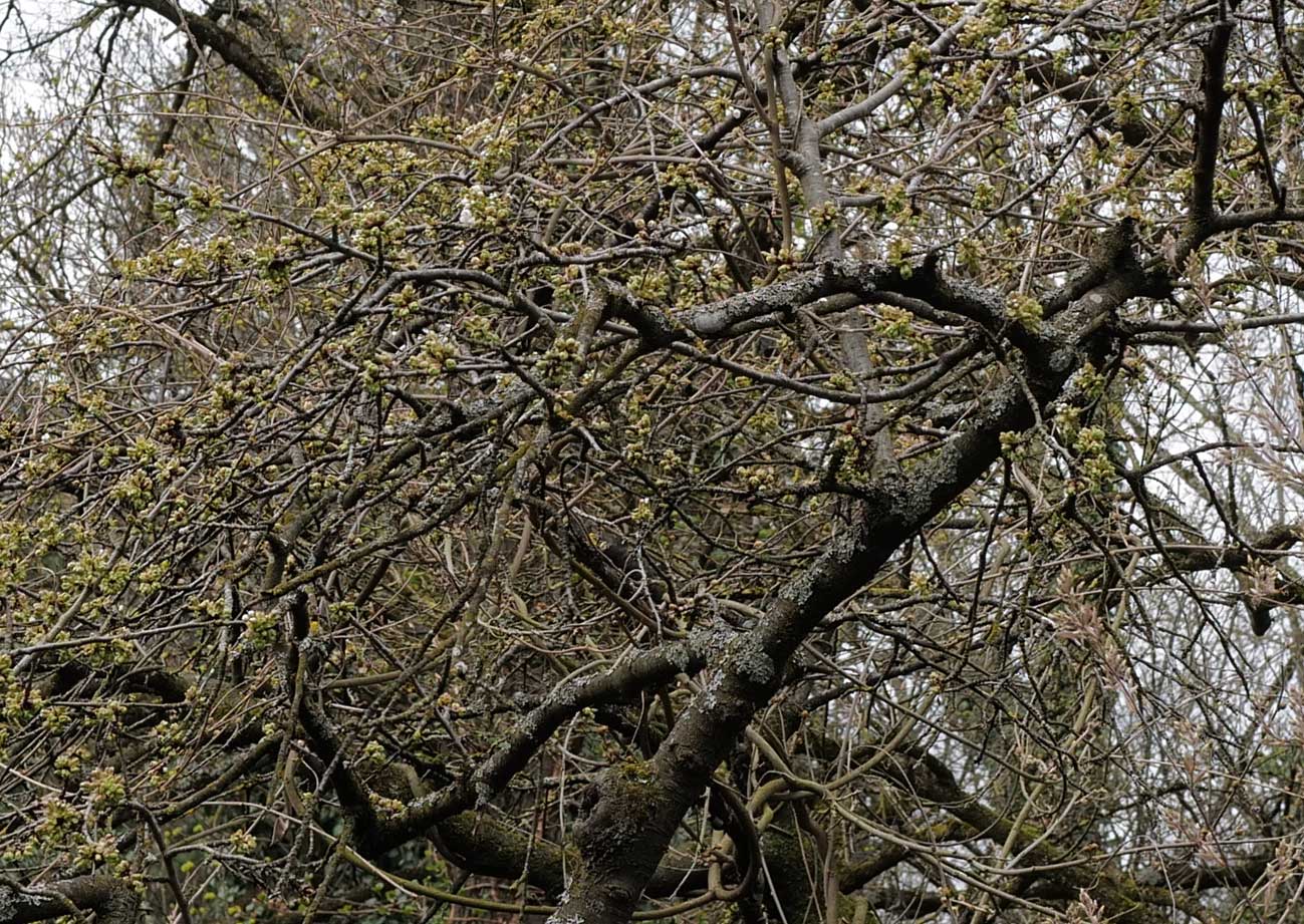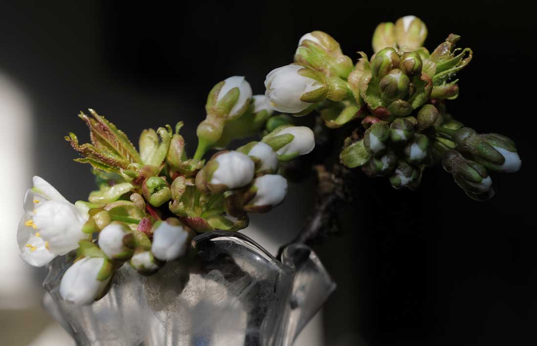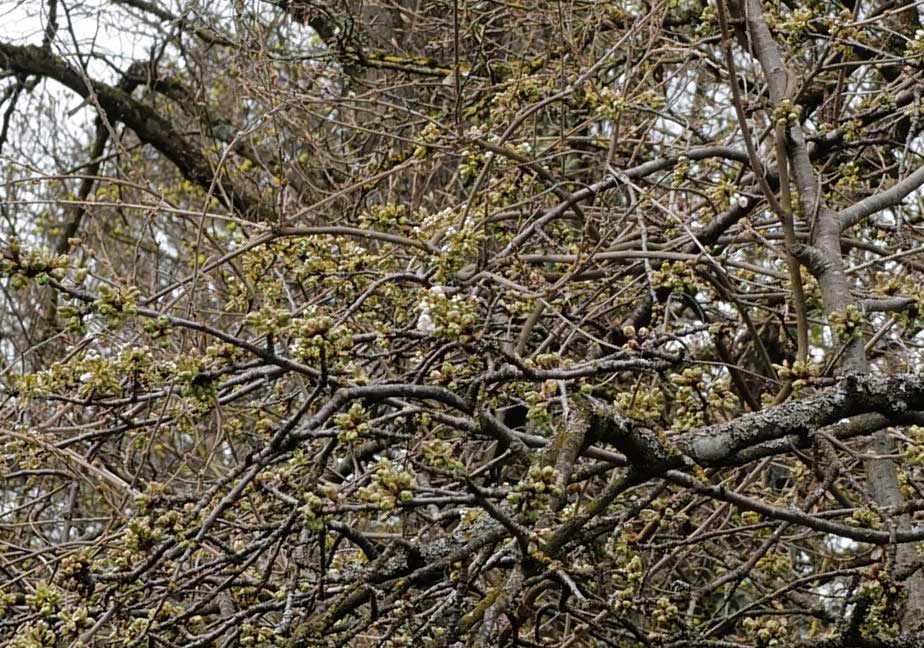 So reich an Knospen ist der Kirschbaum vor der Blüte hier am Fenster