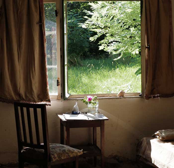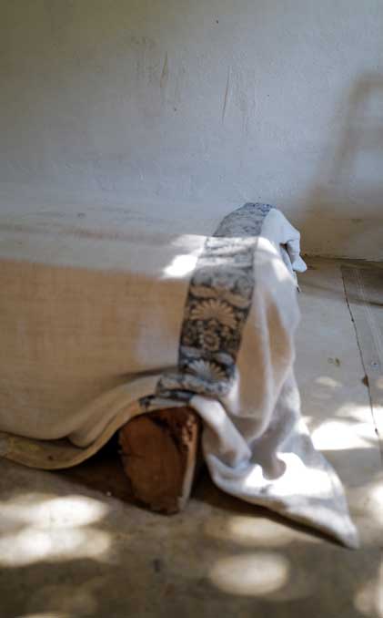 was die Mautner Mutter aus ihrer Druckerei in G. uns bis hierher noch ist, an den Fenstern und auf den Betten, Hand gewebt und gefärbt wie gedruckt, 45 aus London zurück, so nach alter Väter Art, nun hier auf den alten Balken des Turms in N.