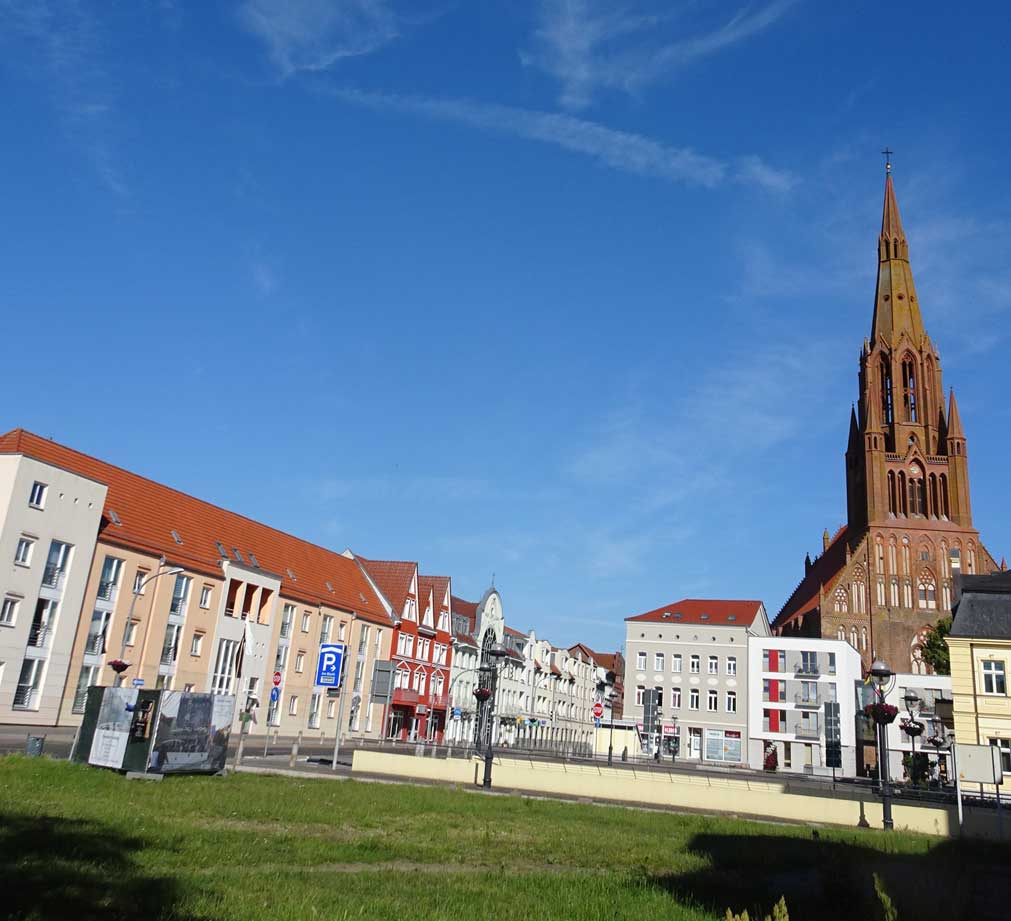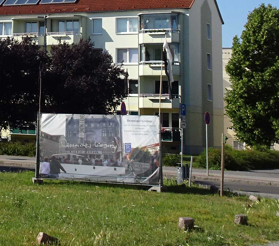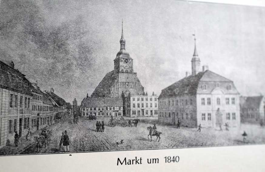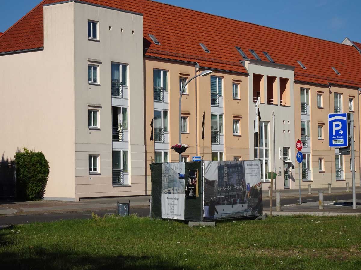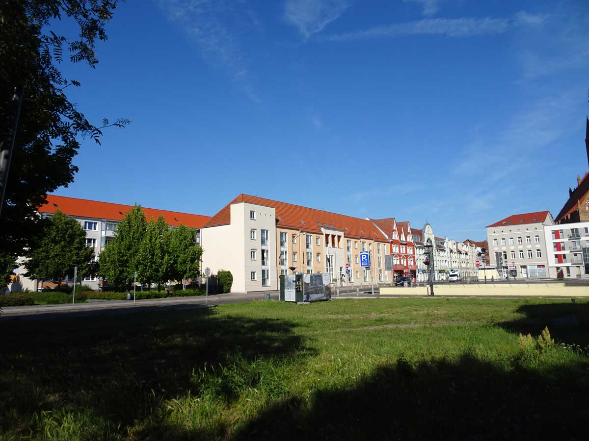 Und das ist die Südseite des Marktes nun. Als wir vor 8 Jahren versuchten sie mit ihren Fassaden mit vergrösserten Fotos an Gerüsten aus Spenden nochmal zu installierem, war vorher das Raumgefühl für diese Begrenzung des Marktes seit 1945 verloren. Alle dachten inzwischen die Plattenbauten dahinten sei der Markt, bis dahin. Dann die Bäume quer durch gepflahzt, dass man wusste wo man ist und geht zum Rathaus und gefasst und ordentlich durch die verbrannte Leere mit Grass drüber. Zuletzt jetzt die Bäume aus Spenden wieder der Bürger als Parkt für die Premiere des Films darüber an Tischen zu sitzen. Im Halbschatten und unter dem Regen, Gerade wieder ausgetrieben dieser hier, der chon aufgegeben kahl war und verloren schien. Auf schottrigem Untergrund. Gewachsen nun.