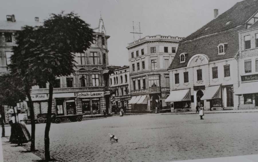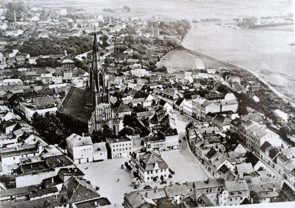 Die Süd-Seite historisch des Marktes von oben mit dem alten Rathaus vor 45 in der Mitte
