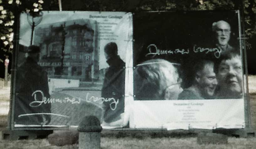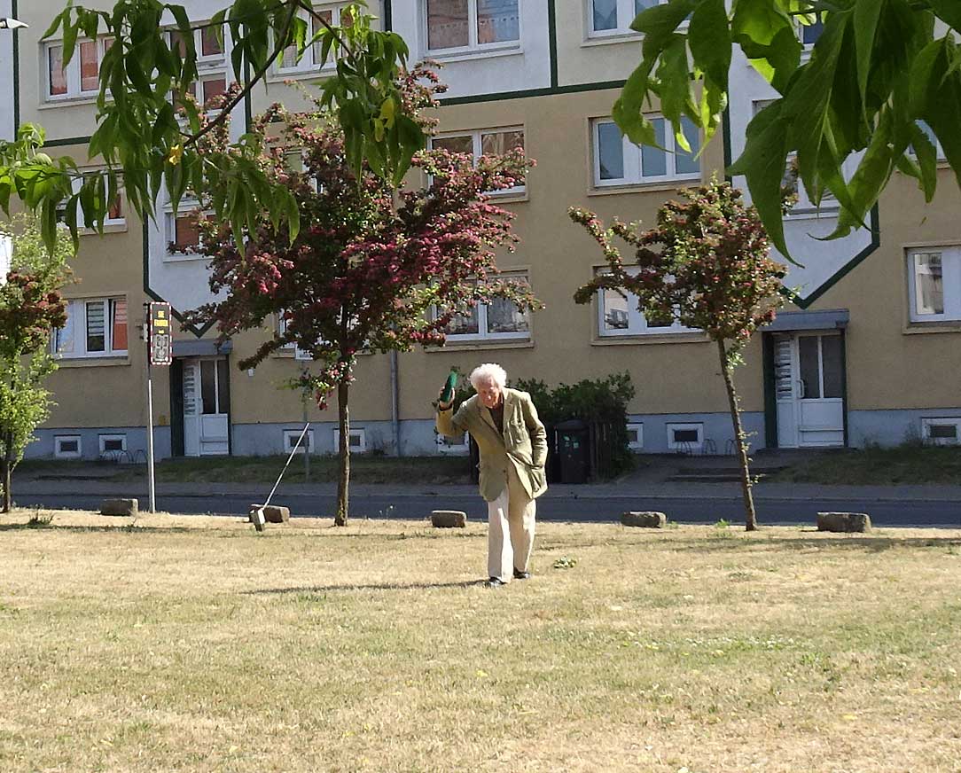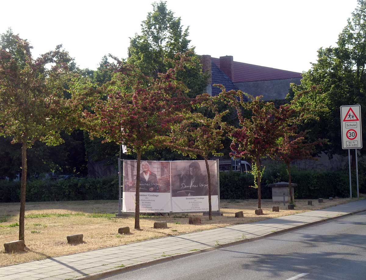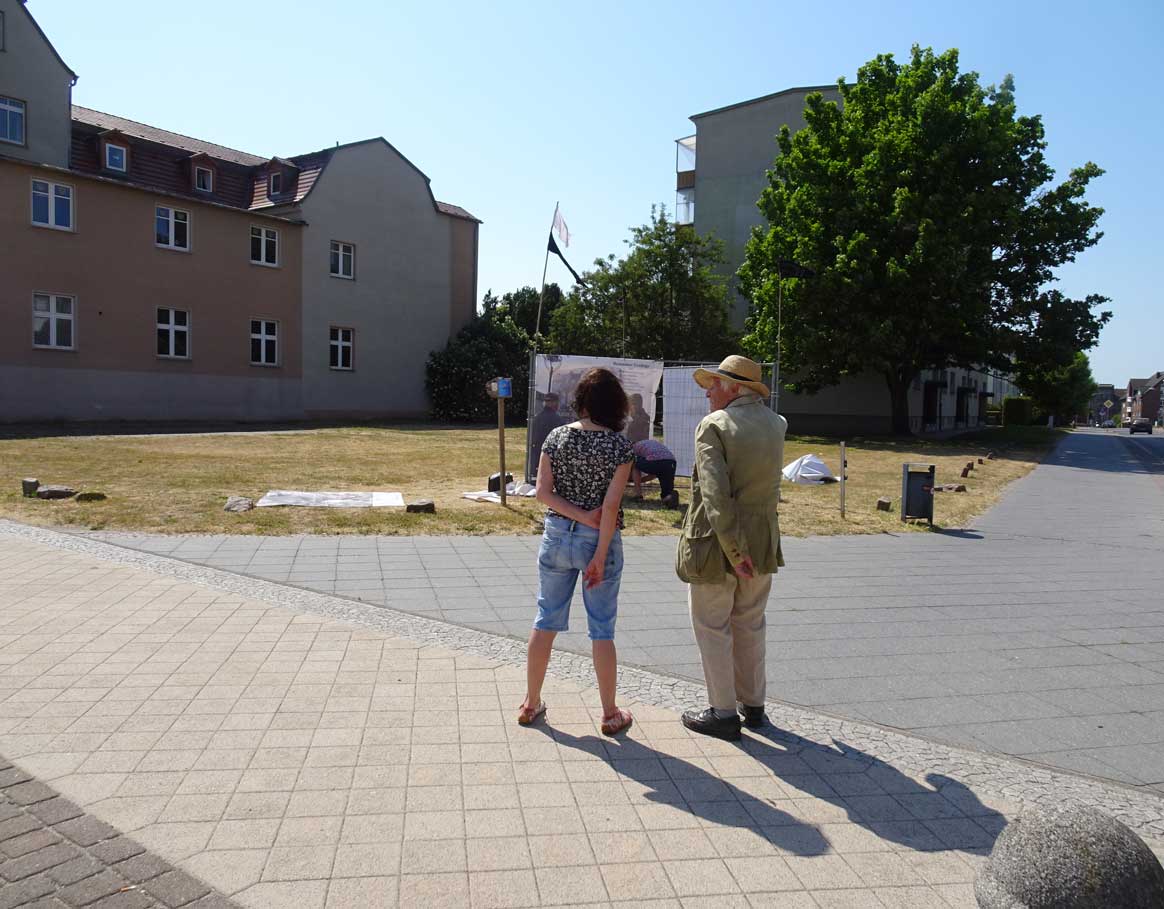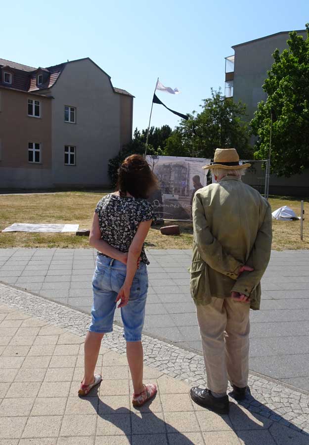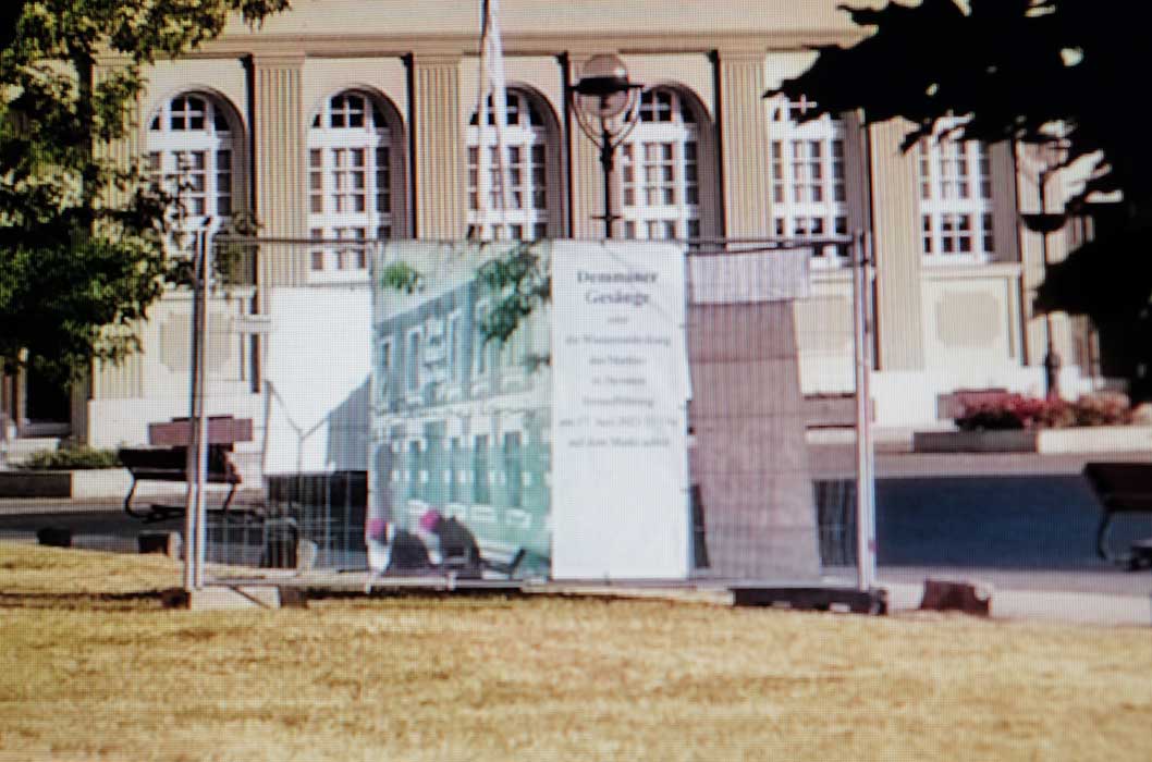 Und von da, an der Nord-Ost Ecke, die andere Station. Die ehemalige Südseite des ehem. Platzes, was dahinter lag als grüner Rasen nun, der alles bedeckt, was da war, von uns kurz wider errichtet im Film als Fassaden, und was darunter liegt. Wir jetzt mit dem nächsten Monument des Films nun. Mitten hindurch der Gang zum Keller früher, heute mit unseren Bäumen des Films auch, als Spenden, jeder Baum ein Name.