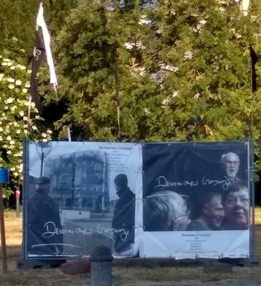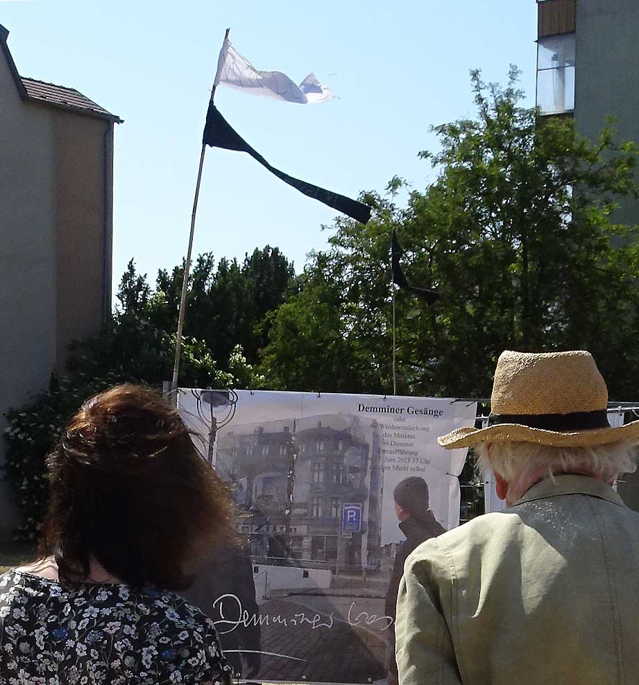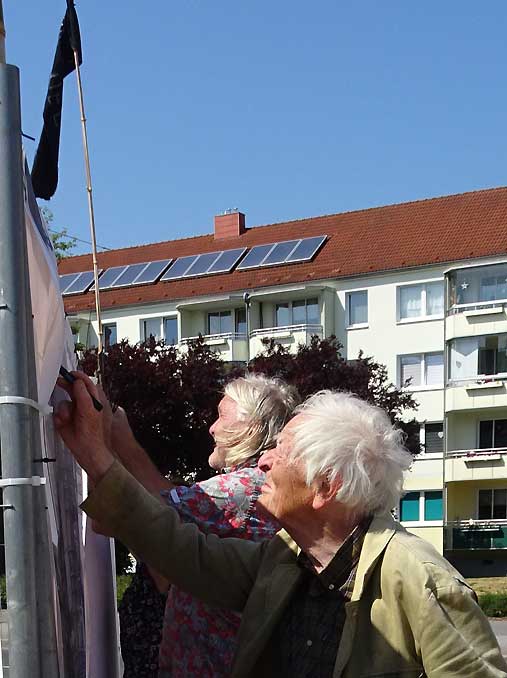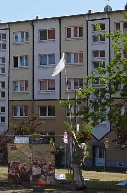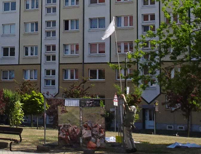 Der Schreckmoment am Rande, wer sich auskennt hier, weiss was das heisst, von wem genäht, von wem die Kamera, schon Ersatz fü einen verlore, beim Nähen der Fahnen an den Stock. Alles schreckt auf. Suchen bis an die Keller des Plattenbauts. Wo nie sonsg gewesen. Nun alles wieder gut.