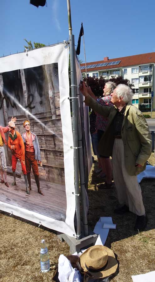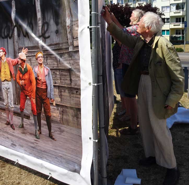 Was zu tun war. Erste Grossfotos mit aktuellem Titel für die Strassengitter im Karree anstelle der provisorischen "Räuber" von 2018 im Film.
