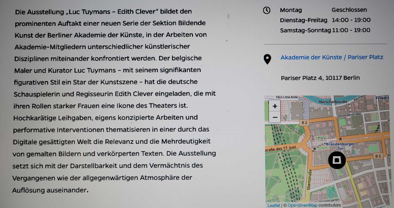 Nach 40 Jahren DIE NACHT nun in Berlin, damals nur in Paris auf dem Theater, von Edith Clever präsentiert in der alten Akademie der schönen Künste Liebermanns und und Speers -nun beim Tuymans gebrochen im Schnee. Und was fehlt, zu ergänzen wäre dann am anderen Ort in Berlin aber Mitte September doch spannend.